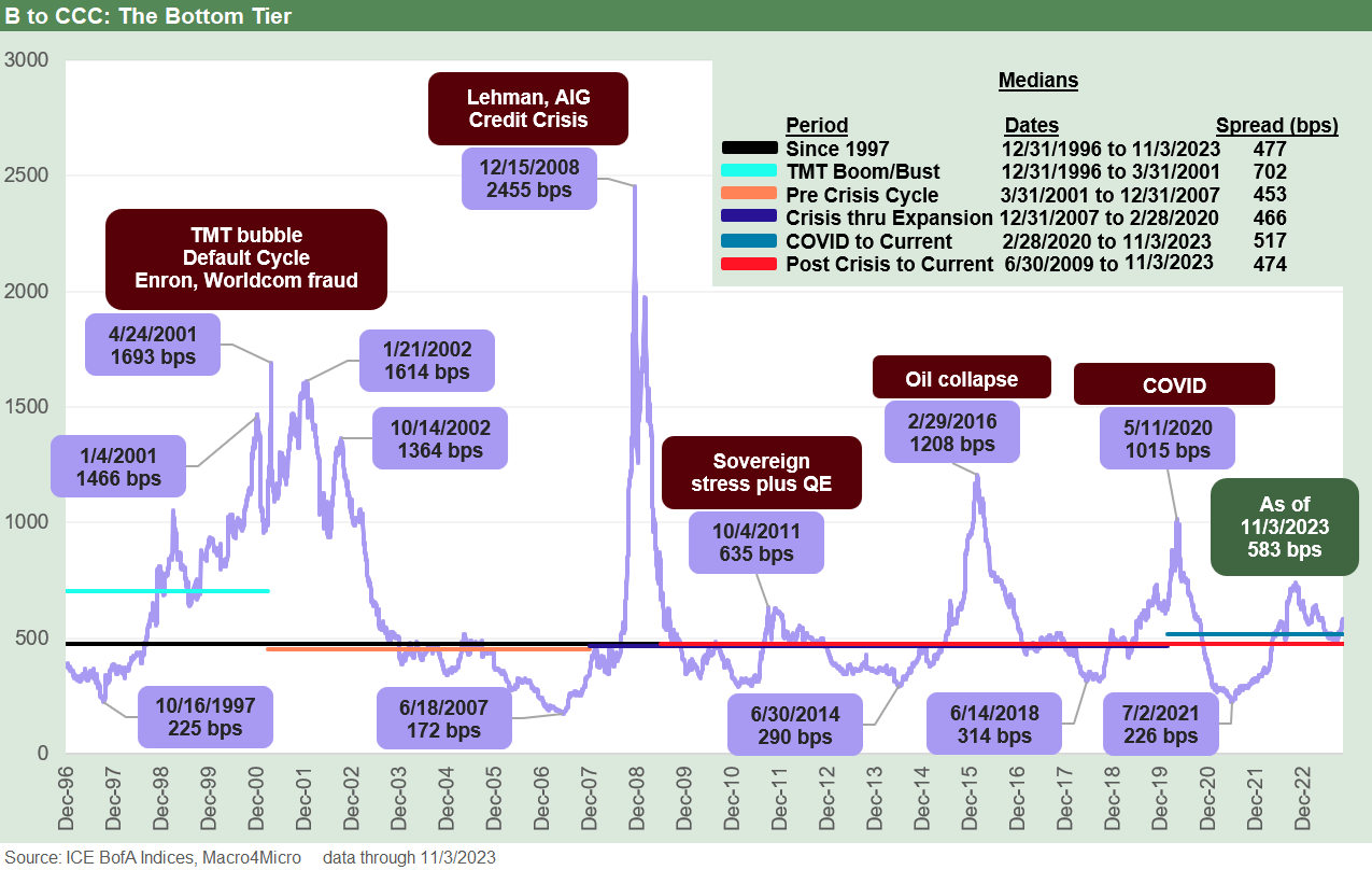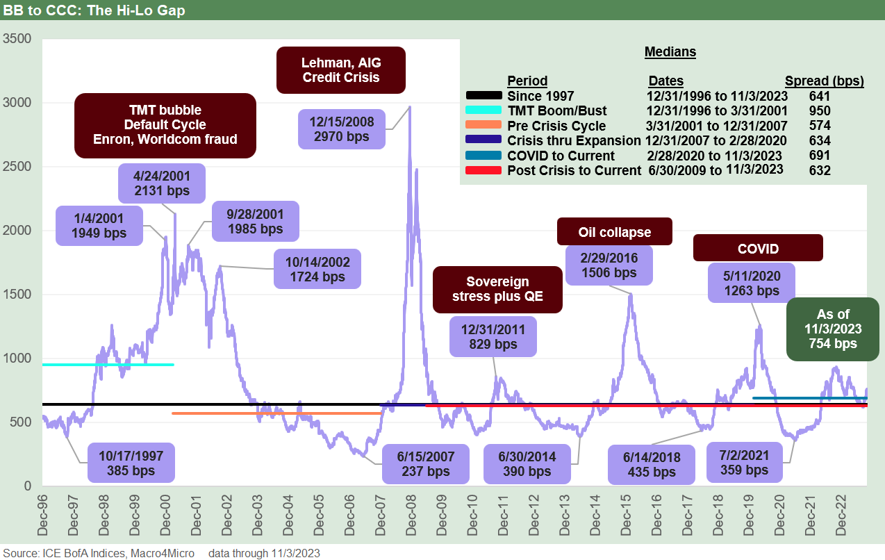 The +754 bps BB vs. CCC differential (11-3-23) is substantially wider than the long-term median of +641 bps and naturally even more distant from the lows. The peak differential noted in the chart tells a clear enough story on how much the high end and low can diverge. The 2001-2002 and 2008 periods were peak default risk and crisis periods. The 2011 whipsaw tied into sovereign stress while 2016 was mostly (not entirely) about oil and gas. COVID was a new one for the modern capital markets.