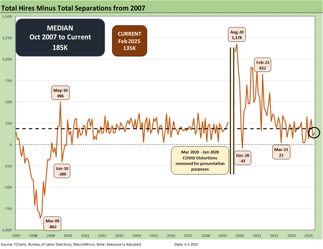 We are a day late on our JOLTS update on the numbers released yesterday, but it did not look too interesting while we were juggling some other research. The 1-month lag on JOLTS from Feb 2025 might not be all that exciting with March volatile and Trump seeking to reinvent global trade with Liberation Day news later today. We get March payroll numbers on Friday. That said, the JOLTS numbers show clear signs of cyclical slowing but are not waving contraction flags by any stretch. It would take a lot more economic pain to get there.