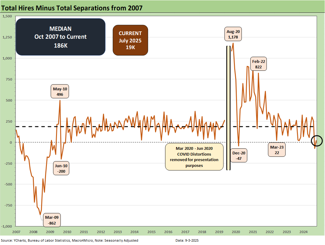 The Hires vs. Separations time series make for interesting numbers but tough charts to plot visually given how much the spike in Separations/Hiring during COVID distorted the numbers from March 2020 to June 2020. The swings literally were off the charts. For presentation purposes, we adjust the charts above to exclude the raw data for those months to get a better vantage point on somewhat more normal times. Compared to COVID, the credit crisis seems “normal” in terms of the job count moves.