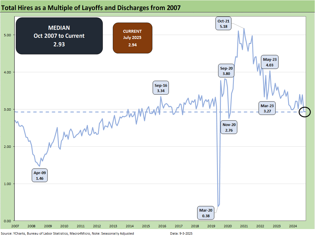 The above chart updates the ratio of Hires to Layoffs/Discharges. The relationship moved significantly lower this month from 3.24 to 2.94 just in line with the long-term median of 2.93 from 2007. The post-2007 period includes the longest recession since the Great Depression (Dec 2007 – June 2009) followed by the longest expansion from June 2009 to COVID (Feb 2020).