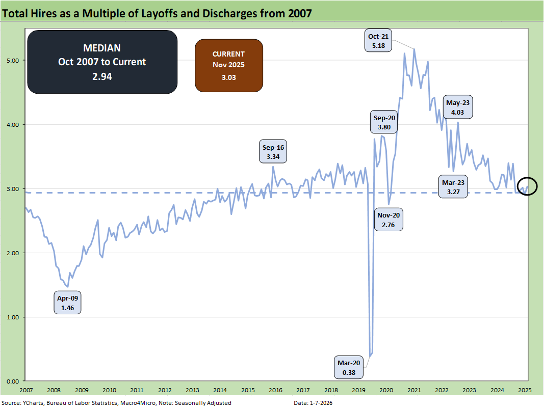 The above chart plots Hires vs. Total Separations on a SAAR basis. Separations include Quits, Layoffs/Discharges, and “Other Separations.” Total Separations edged higher by +11K in Nov from Oct and were near flat at +7K YoY. We typically do not find “Total Separations” particularly interesting as a multi-line net number.