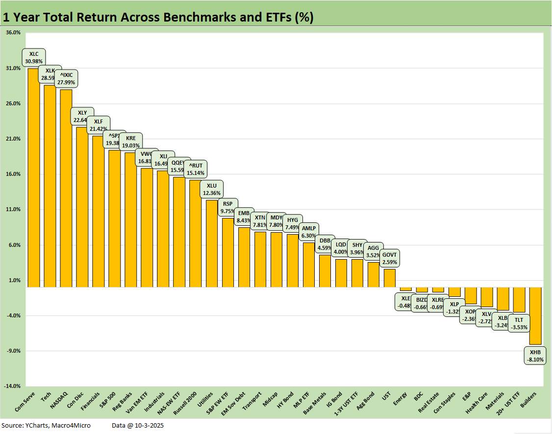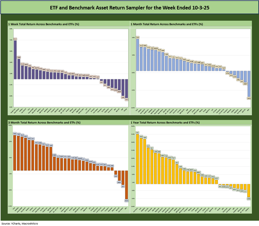 The 1-week return chart for the 32 benchmarks and ETFs weighed in at 24-8. We covered it in detail in our Mini Market Lookback: Chess? Checkers? Set the game table on fire? (10-4-25).