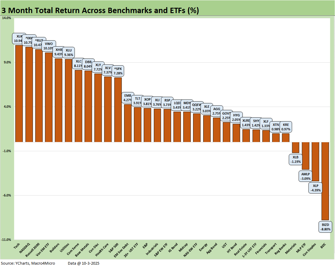 In the top quartile, we see the Tech ETF (XLK) at #1 followed by NASDAQ at #2 and an impressive quarter for the Russell 2000 at #3, EM Equities (VWO) at #4, and Homebuilders (XHB) making a comeback at #5. Utilities (XLU), Communications Services (XLC), and Base Metals (DBB) round out the top quartile.