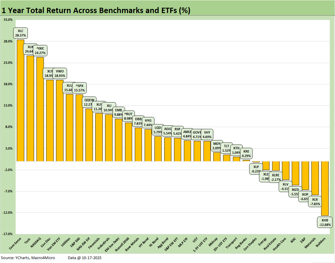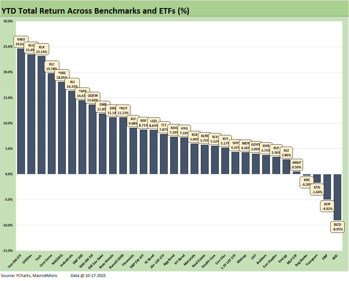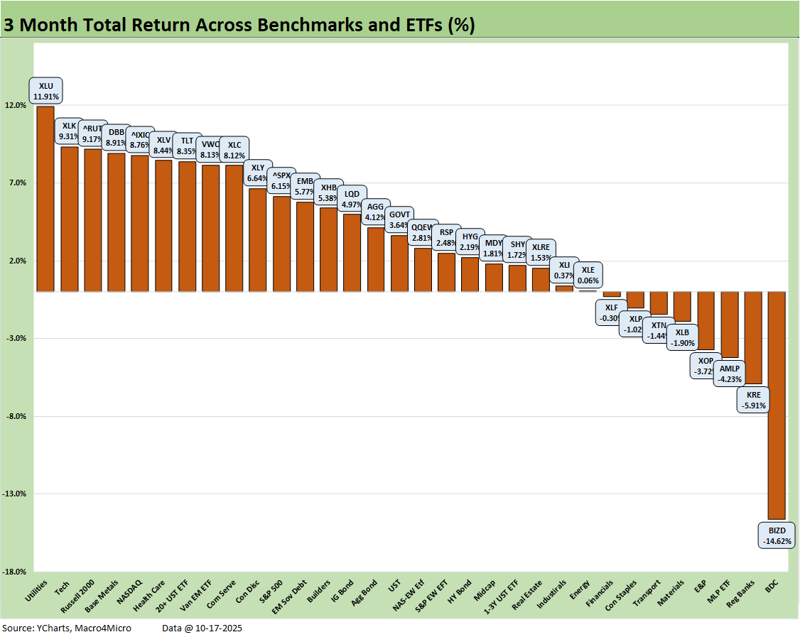 The rolling 3-months weighed in at 24-8 with some of the expected ETFs struggling in the bottom quartile in negative range. The most beaten up is the BDC ETF (BIZD) at an atrocious -14.6% in last place. First Brands and Tricolor headlines have sent the market reeling. There is no shortage of BDCs that will be reporting Sept quarter earnings into early November, and investors will be applying the Jamie Dimon cockroach theory looking for valuation question marks and soft spots.