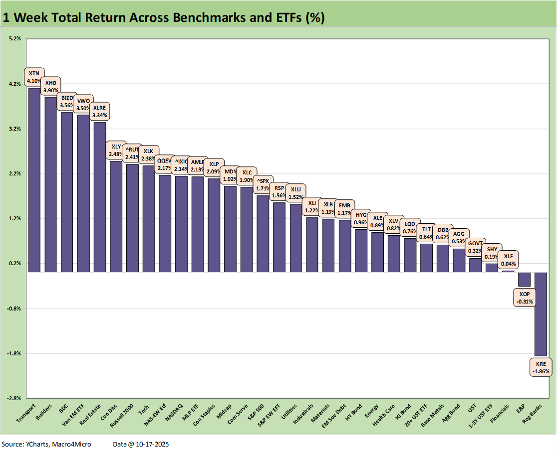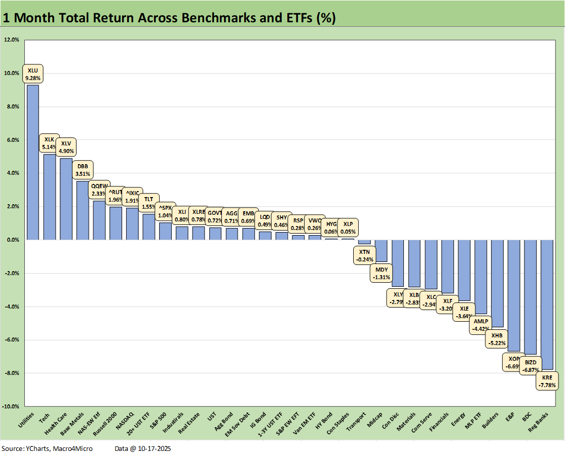 We already looked at the 30-2 score for the 1-week returns in our Mini Market Lookback: Healthy Banks, Mixed Economy, Poor Governance (10-18-25). We see 5 of the ETFs above the 3% return line for the week with a few of the more beaten down ETFs of the past 1-month period such as Homebuilders (XHB) and BDCs (BIZD) getting a “worst shall be first” bounce this week. Earnings season could reassure on the fear of the unknown and especially for BDCs.