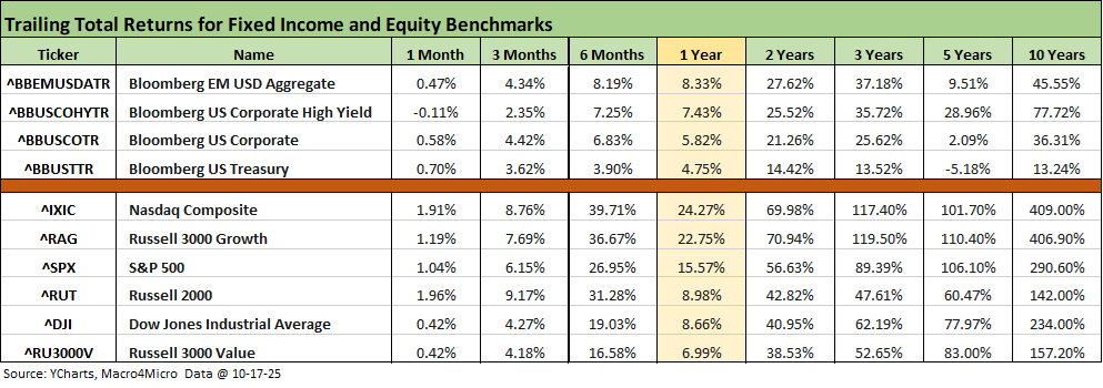 The week posted solid asset returns with equities and the UST curve both positive. With a weak starting point from last Friday’s ugly close, this week brought a strong set of numbers. The weakest of the time horizons we track below (trailing 1-month) is still only 20-12 favoring positive in our group of 32 benchmarks and ETFs. The “good equity, good debt” story remained intact with October (99.0%) and December (94.0%) FOMC cuts still posting overwhelming odds by FedWatch for -25 bps at each meeting.