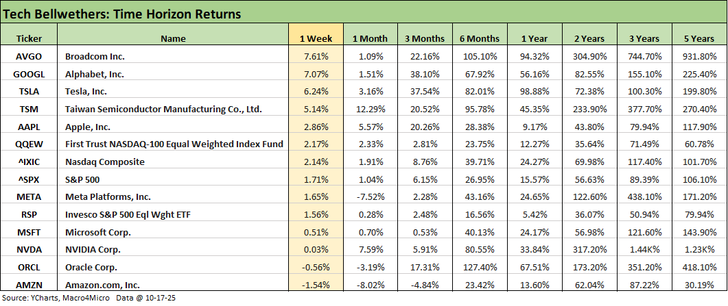 We already looked at the 1-week returns for the tech bellwethers in our Mini Market Lookback: Healthy Banks, Mixed Economy, Poor Governance (10-18-25). As covered in commentaries along the way, the dispersion across the “Mag 7+3” ( the 7 + Broadcom, Taiwan Semi, and Oracle) has been a recurring feature that we see across the trailing 3-months. Even with some names faltering into late 2025, the trailing 1 year and 2-year periods continue to drive home the tech boom vs. the broad market with the chip players in the lead. The recent weeks have been choppy, and the tech names do not need increased tension with China as the recent reaction to the trade spat drove home.