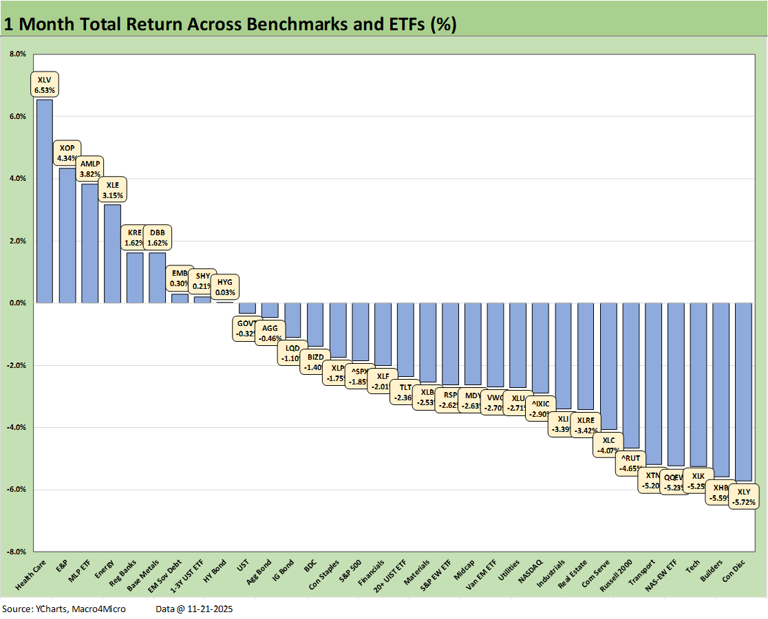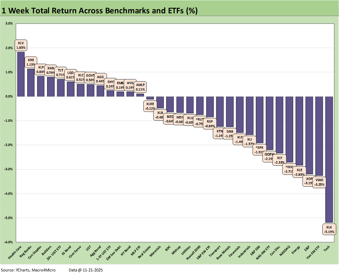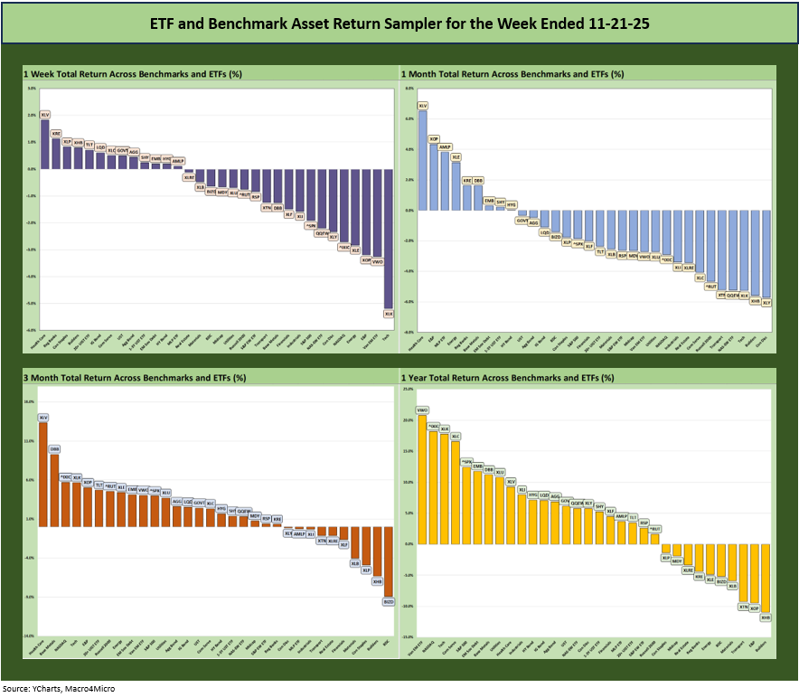 We already looked at the 1-week returns for the 32 benchmarks in our Mini Market Lookback: FOMC Countdown (11-23-25). With a positive vs. negative score of 13-19, the shift is there but with all 7 bond ETFs in positive range.