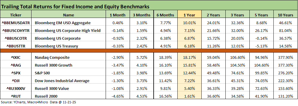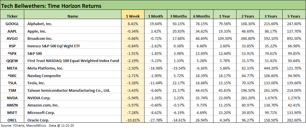 We already looked at the tech bellwethers in our Mini Market Lookback: FOMC Countdown (11-23-25). With 6 of the Mag 7 in negative range and 9 of the “Mag 7+ 3” (including Broadcom, Taiwan Semi and Oracle) also in the red, the numbers clearly show a bad week. With only 2 of the 10 posting positive returns for 1-month, it has been a shaky period. The rolling 3-month returns frame up better but in a very wide range.