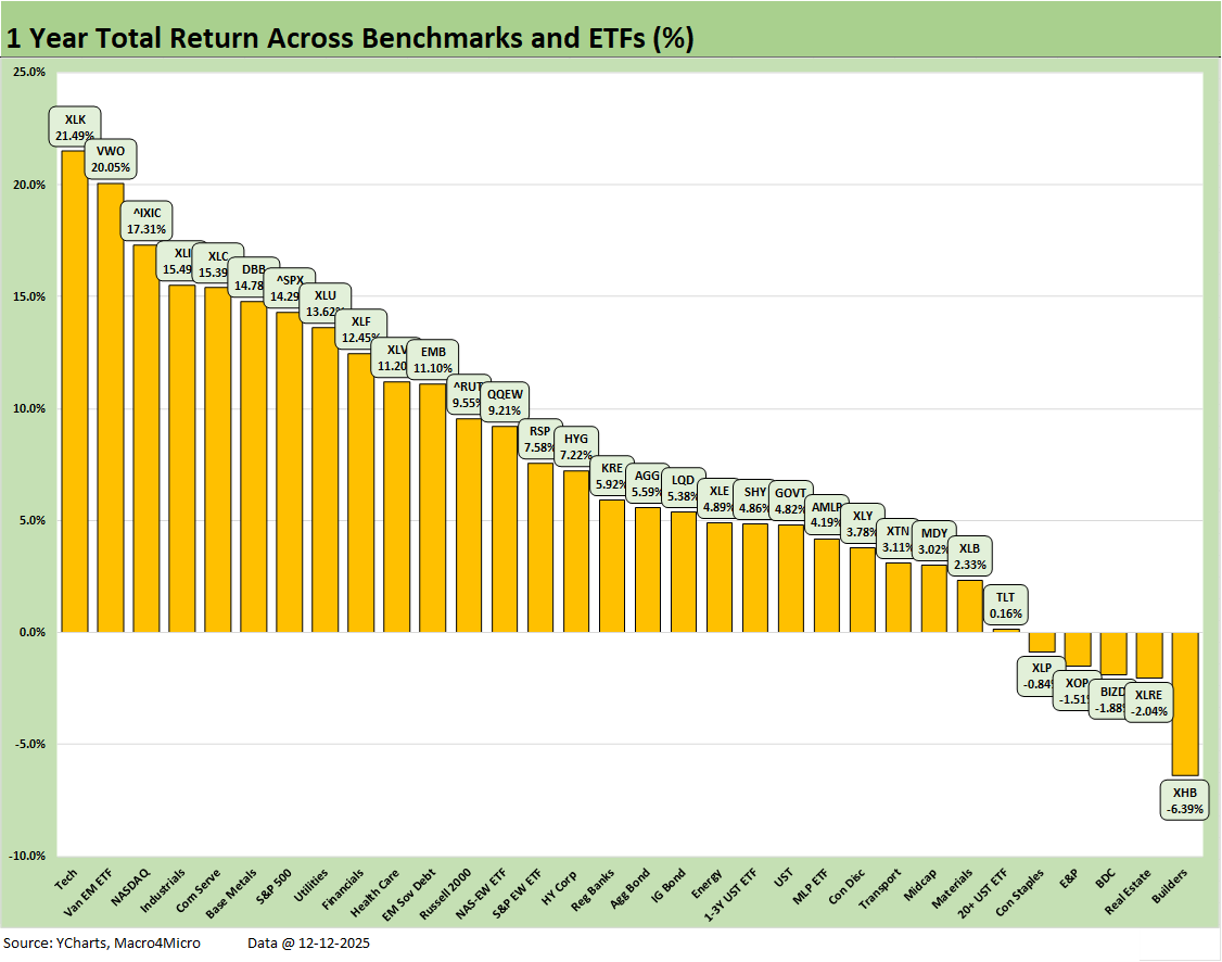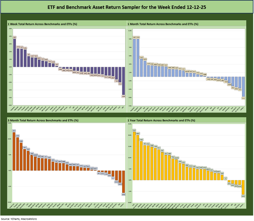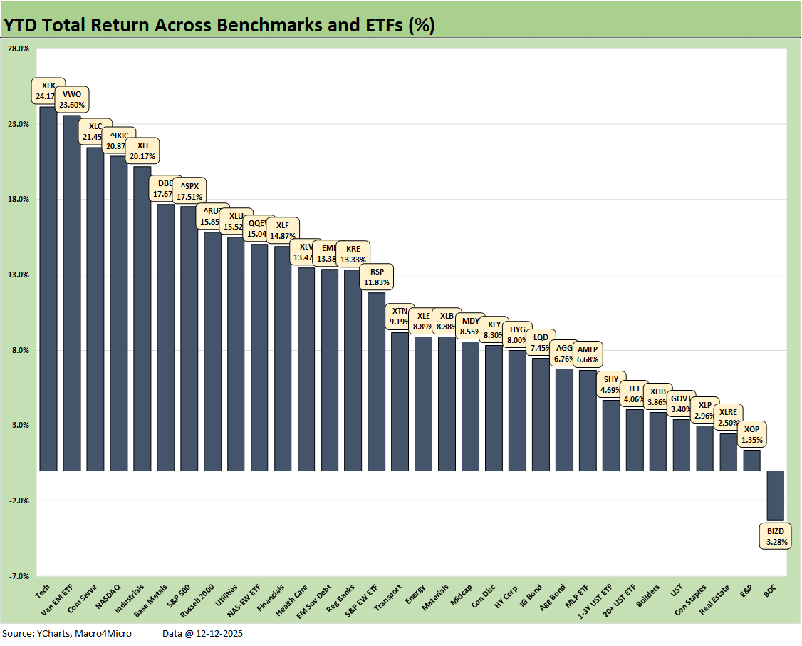 As we covered in our Market Lookback: FOMC Fragments, Rate Debates Murky (12-13-25), the YTD returns posted an impressive 31-1 score. Only BDC ETF (BIZD) was in the red at -3.28% but has been climbing back slowly.
