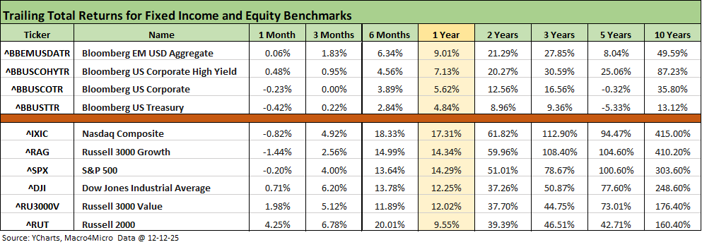 At a YTD return of +17.5%, the S&P 500 looks to be out of the running to see its total return match or exceed 2024 or 2023 with the first back-to-back 25% years since the late 1990s. The NASDAQ at +20.9% will need something very big to happen in the next two weeks to hit the 29% handle of 2024.