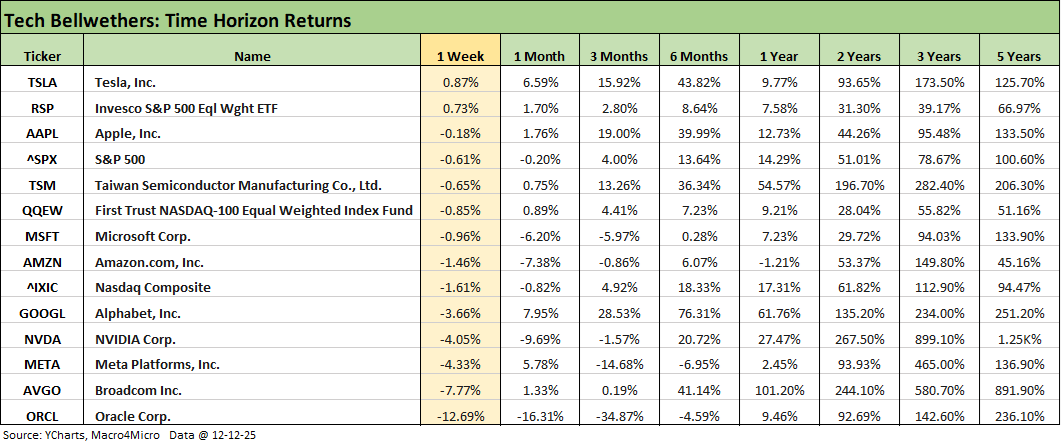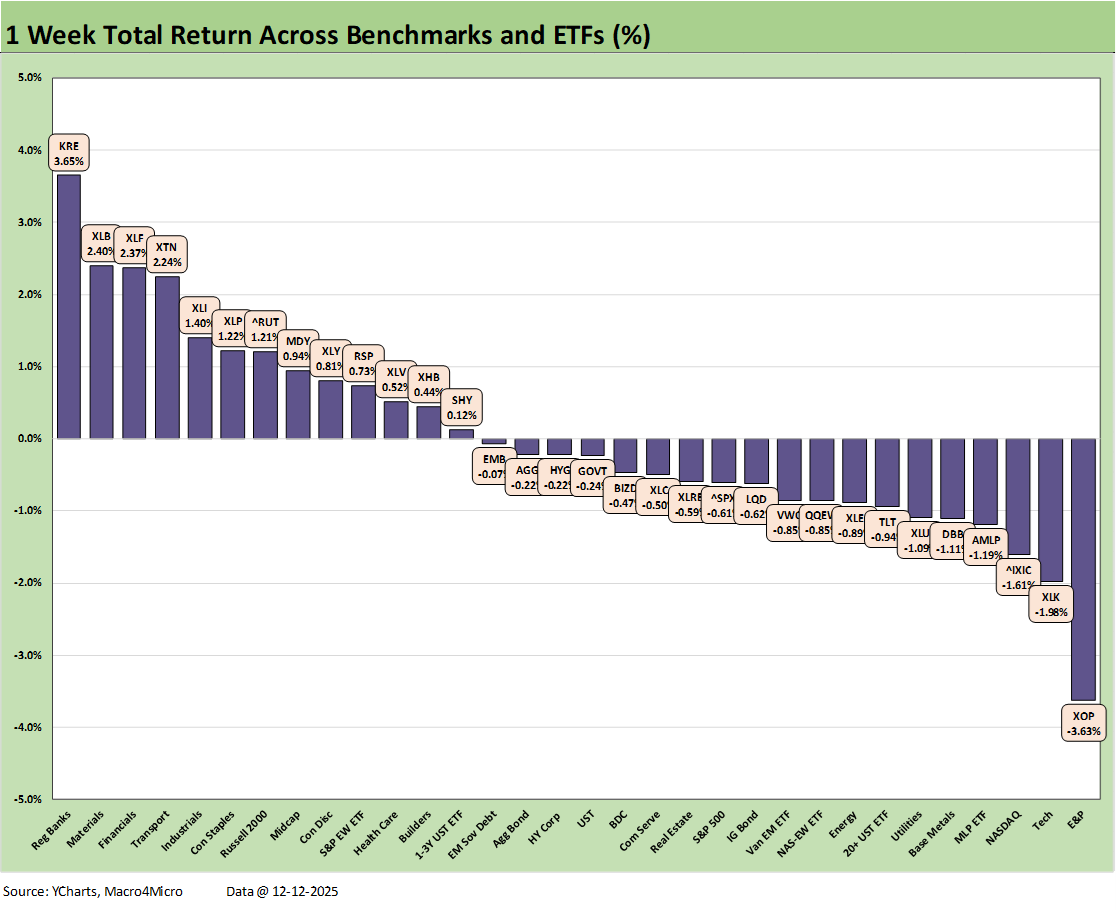We already looked at the tech bellwethers in our Market Lookback: FOMC Fragments, Rate Debates Murky (12-13-25). When you have a single name in positive range (Tesla) with 6 of the Mag 7 in the red along with 9 of the Mag 7+3, it has not been a good week for the growth story lines and valuations.