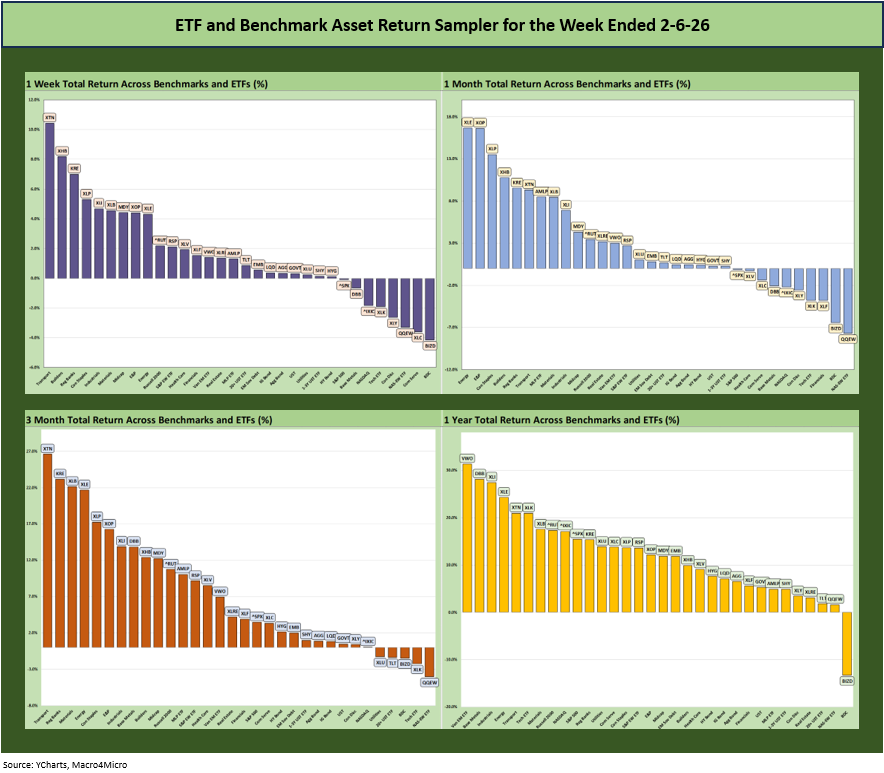 In the next section, we get into the details of the 32 ETFs and benchmarks for a mix of trailing periods. Below we offer a condensed 4-chart view for an easy visual on how the mix of positive vs. negative returns shape up. We see it as a useful exercise in looking for signals across industry groups and asset classes.