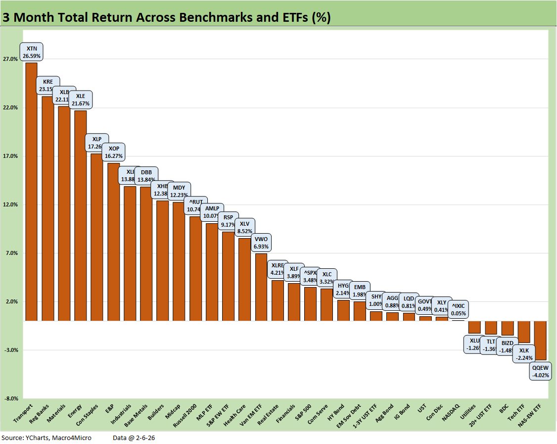 .The 3-month score of 27-5 tells a favorable story but with the notable absence of any of the tech-heavy benchmarks or ETFs in the top tier. The top tier includes Transports (XTN), Materials (XLB), and Industrials (XLI) in a vote of cyclical confidence (and less confidence in tech). Energy (XLE) and E&P (XOP) are in the top quartile on both oil and gas prices. Iran risk and very cold weather offered an assist.