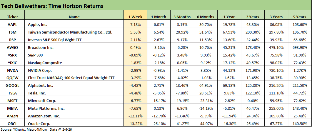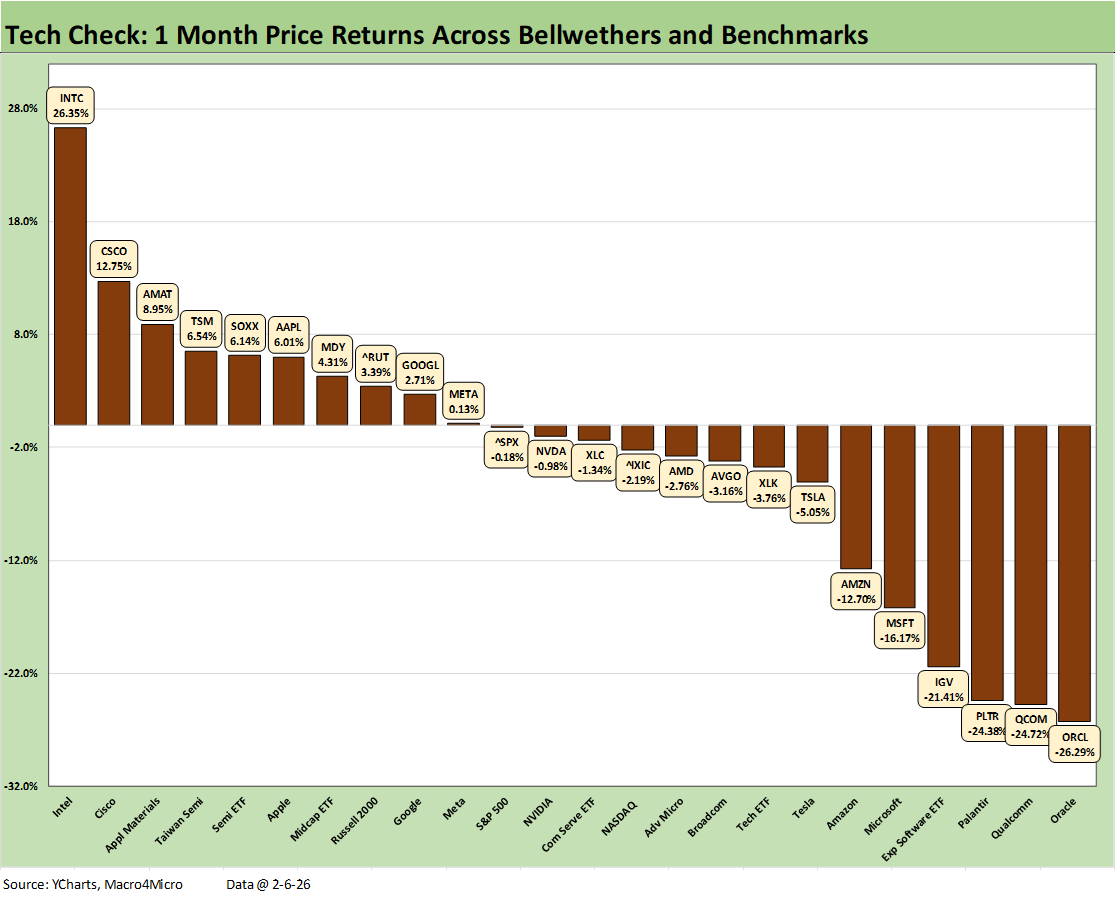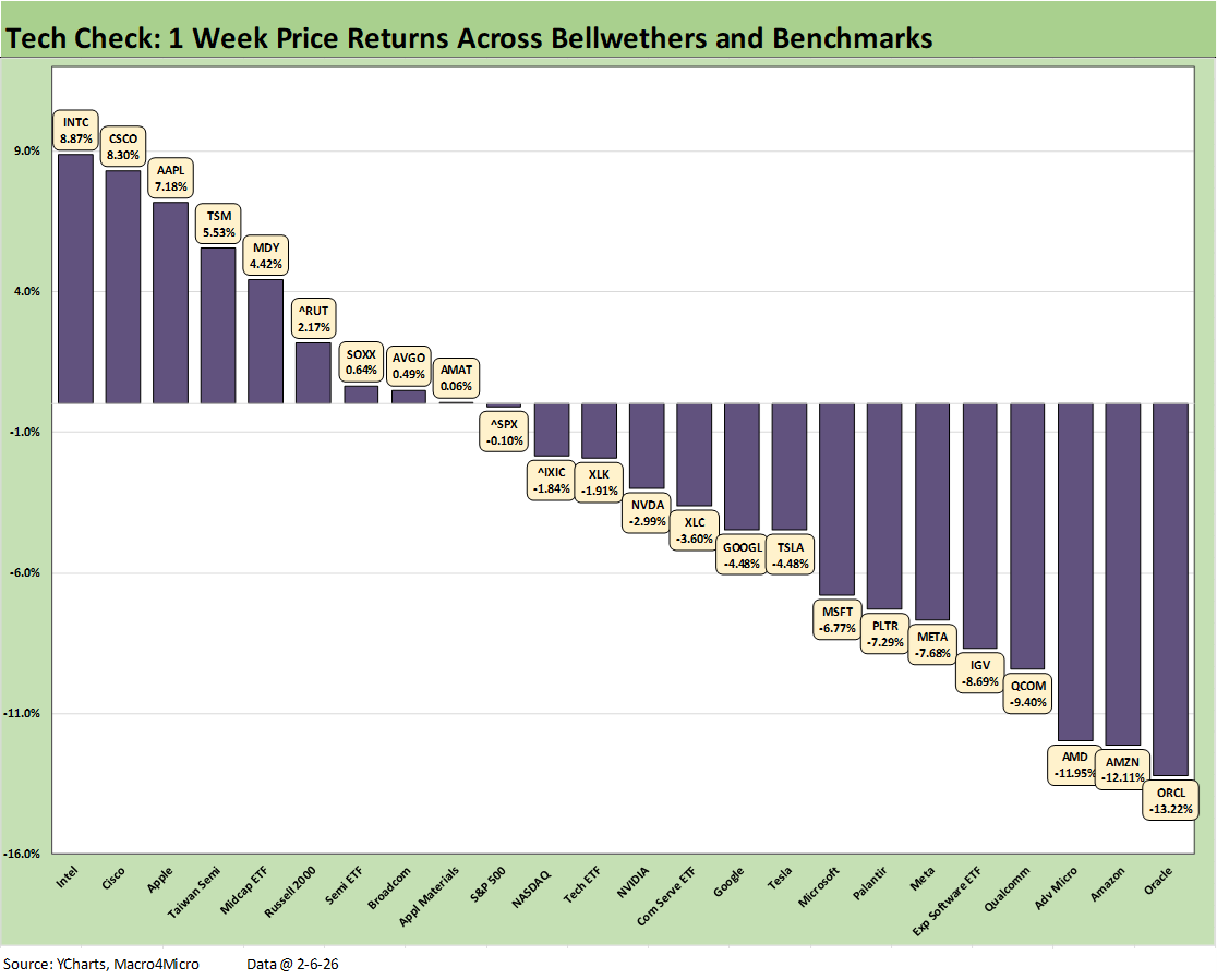 The tech bellwethers and benchmarks saw trends to the downside in recent periods with material divergence across the peer groups including within Mag 7. For the week, only Apple, Taiwan Semi, and Broadcom were positive in single names. We see 6 of the Mag 7 in the red below the S&P 500 and NASDAQ, who were also both in the red for the week.
