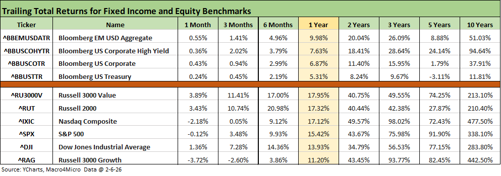 This coming week brings payroll numbers and CPI as the quarterly earnings season continues to post strong numbers. Per FactSet, the blended average for those in the S&P 500 who reported (~60%) and estimates for those yet to report frame earnings growth of +13% for 4Q25 YoY. That continues the strong YoY earnings run in 2025.