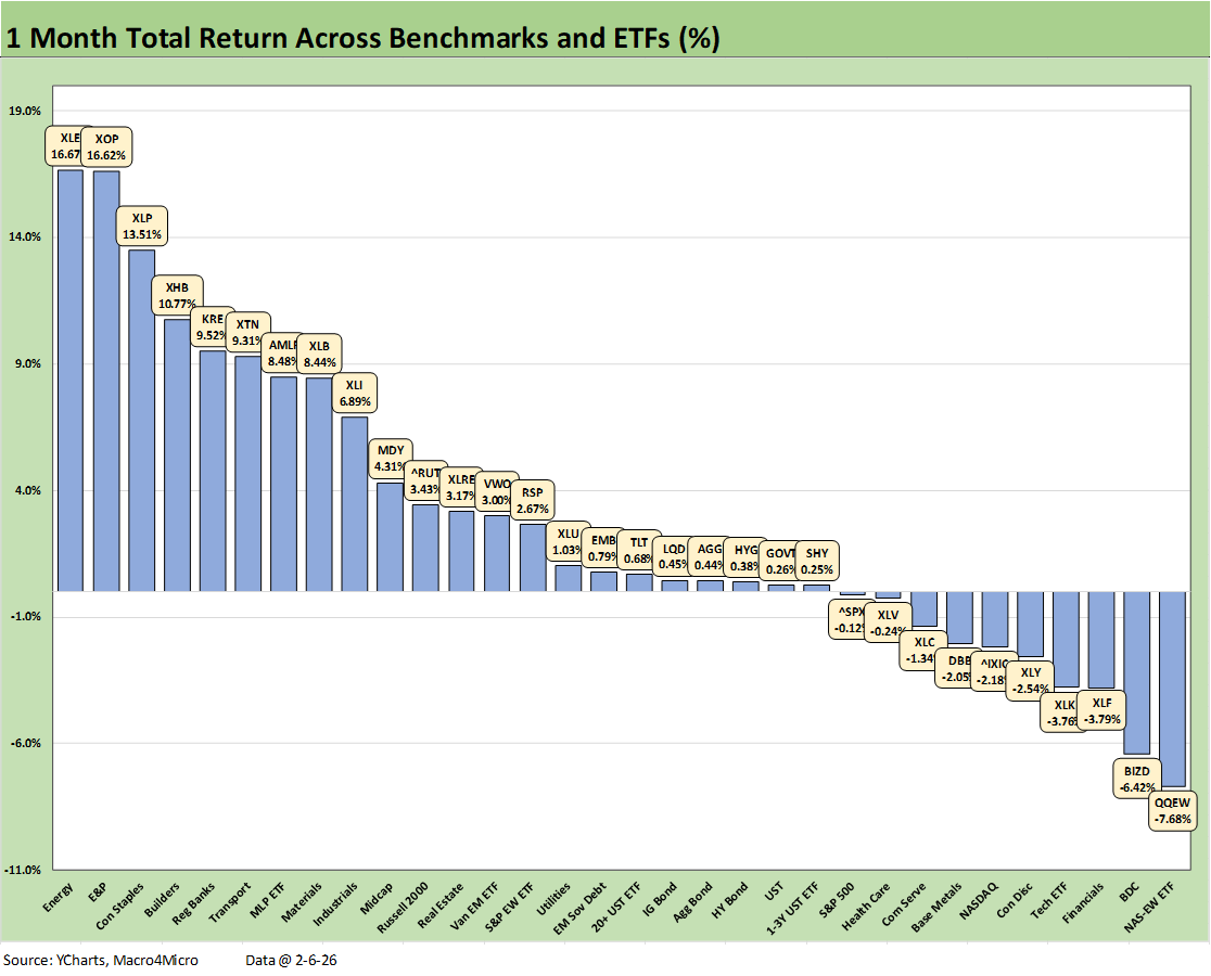 The table above tells a tough 1-month story for tech and growth equities. The small cap Russell 2000 and Value equities benchmarks performed well on sector rotation, earnings trends, and relative stabilization of economic indicators. The CPI story gets a big gut check this week. The same is true for payroll and how that could play into the “Warsh handicapping drill.” The curve could get to be the story again on the flattening vs. steepening debate, but the week and the month was quieter relative to the equity headlines.