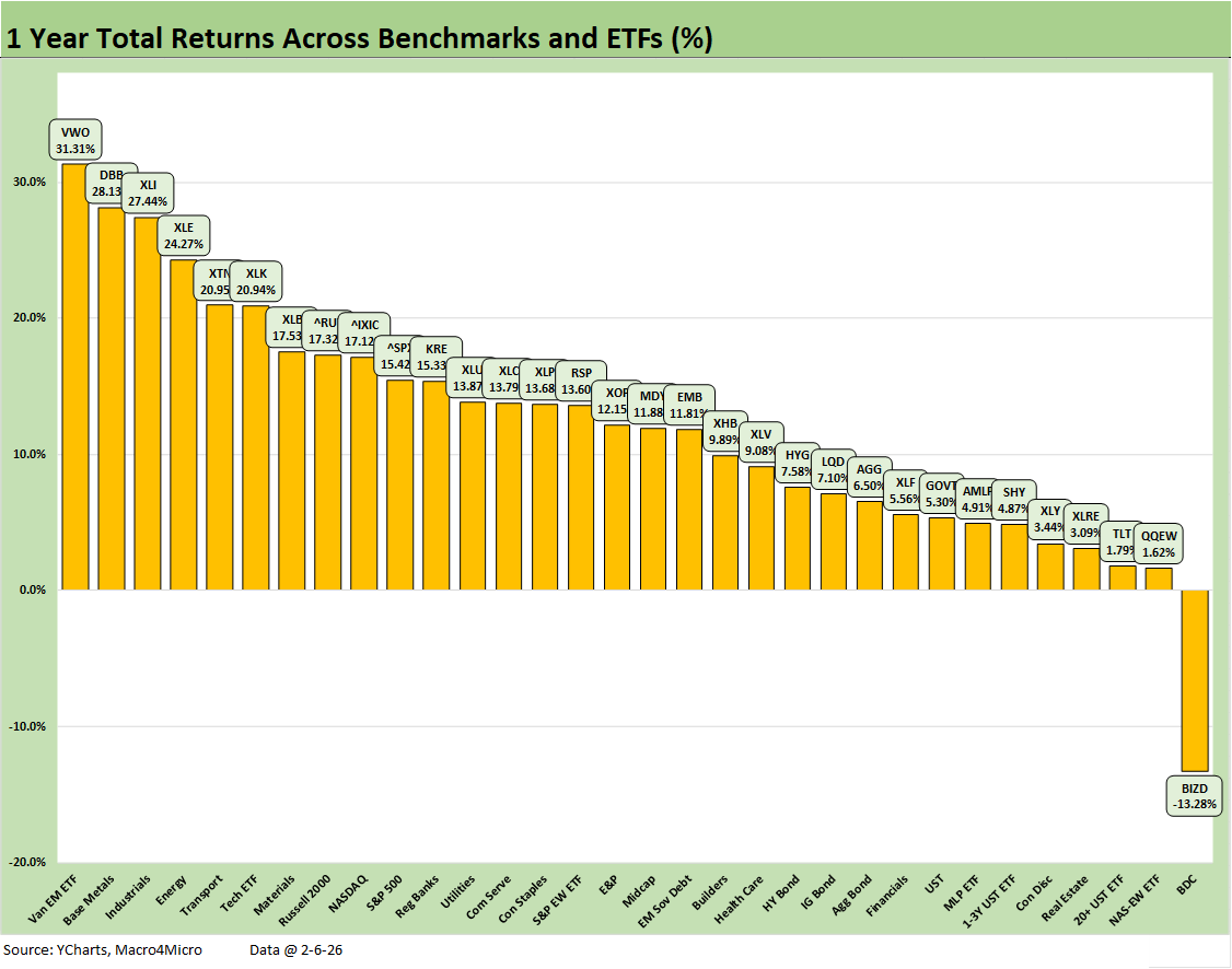 The bottom tier includes at least 7 (ex-DBB, the Base Metals ETF) that were heavily influenced by the tech pressure with the S&P 500 hit by info tech and communications services weightings. Even the BDC ETF (BIZD) was feeling the anxiety around leveraged software and tech services exposure that had been a major dietary item in the private equity sector on the high margins and (theoretically) recurring cash flows. The AI imagination and scenarios are running wild and unsettling some longer-term business models in a service intensive economy