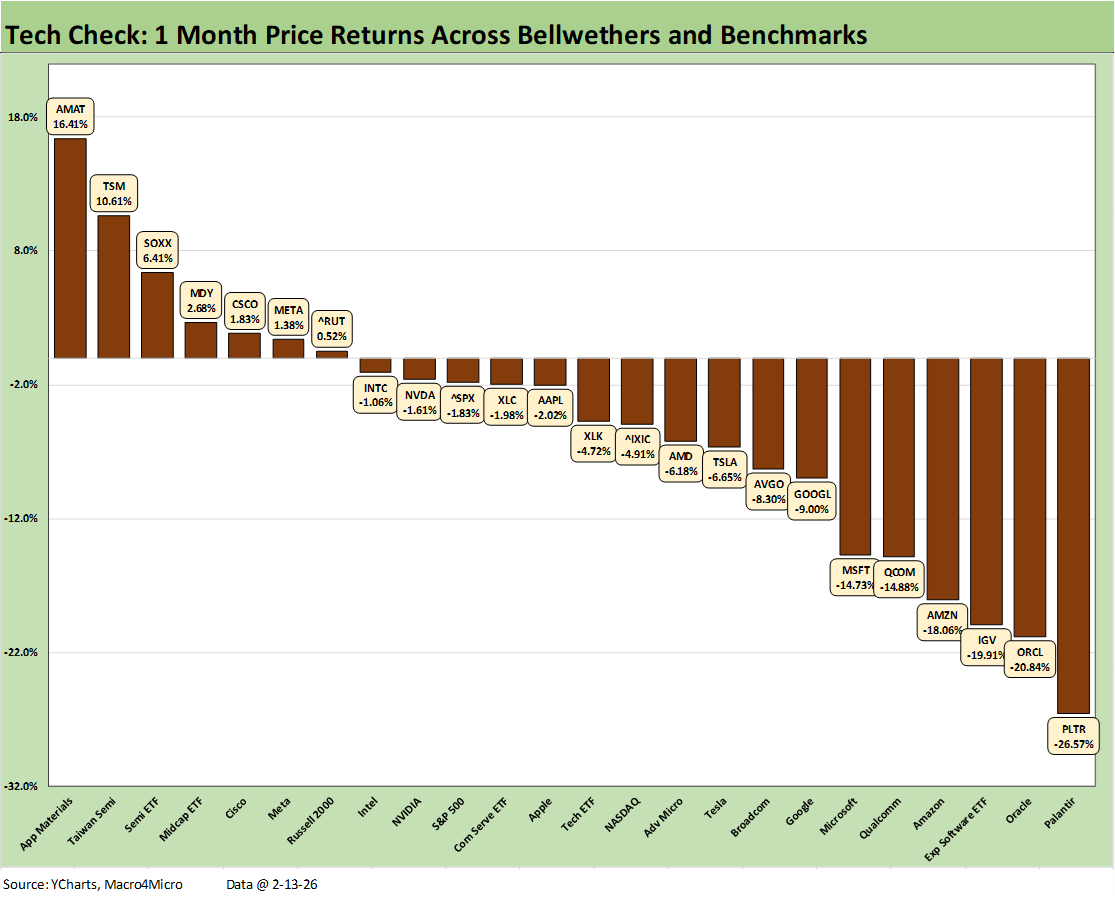 The above chart highlights the tech chaos with so many of the 24 names included above in the red. The weakness is tied to speculative scenarios around AI fallout. We see 17 of the 24 asset lines in negative range. We see Midcaps and Russell 2000 in positive range with the Semiconductor ETF (SOXX), but the few single names in positive range include Applied Materials at the #1 slot followed by Taiwan Semi at #2. The sole Mag 7 name to post a positive return was Meta.