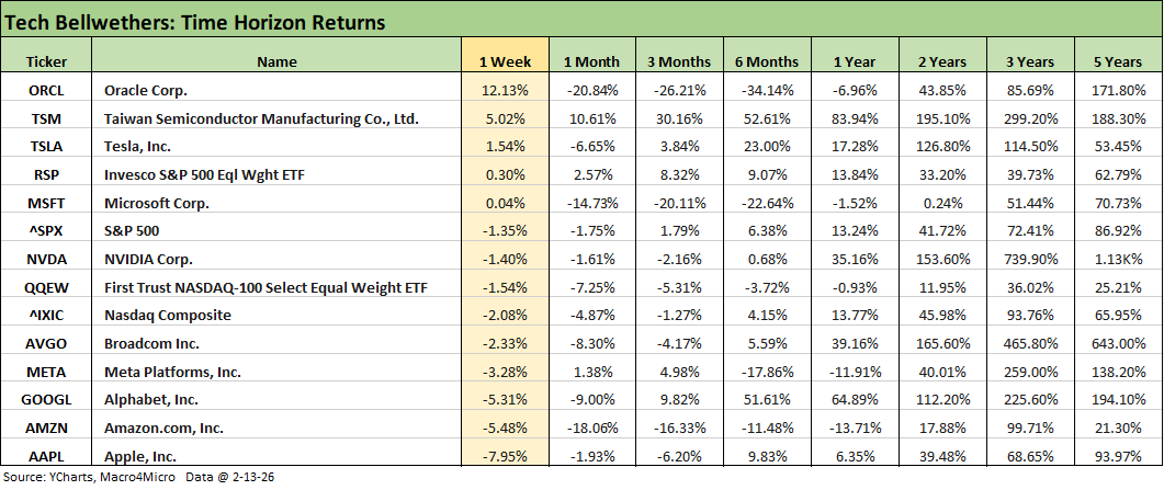 The above table breaks out more time horizon returns for the tech bellwethers including the Mag 7 and the “Mag 7+3” (including Broadcom, Taiwan Semi, and Oracle). For the trailing 1-month, we see 6 of the Mag 7 in the red with only Meta positive. In the other 3 bellwethers, only Taiwan Semi is positive for the month among the “Mag 7+3.”