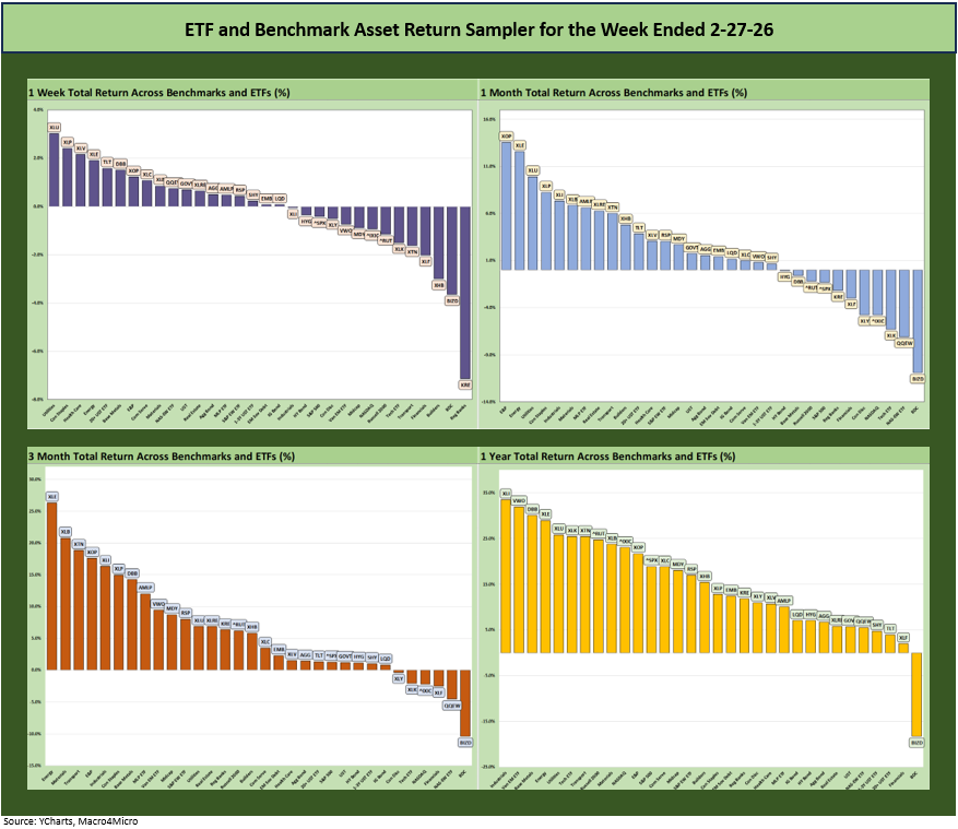 In the next section, we get into the details of the 32 ETFs and benchmarks for a mix of trailing periods. Below we offer a condensed 4-chart view for an easy visual on how the mix of positive vs. negative returns shape up. We see it as a useful exercise in looking for signals across industry groups and asset classes.