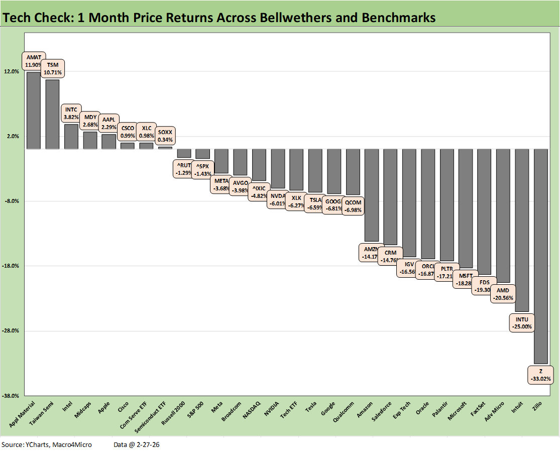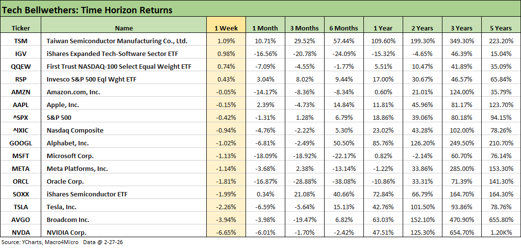 We added a few new lines to the tech bellwether table this week beyond the “Mag 7+3” (the 3 = TSM, AVGO, ORCL). We dropped in the Software ETF (IGV) and Semiconductor ETF (SOXX) given the multi-sector disarray in tech in recent periods. We also break those out in the timeline return charts we started a few weeks ago under the heading of “Tech Check” (see charts below).