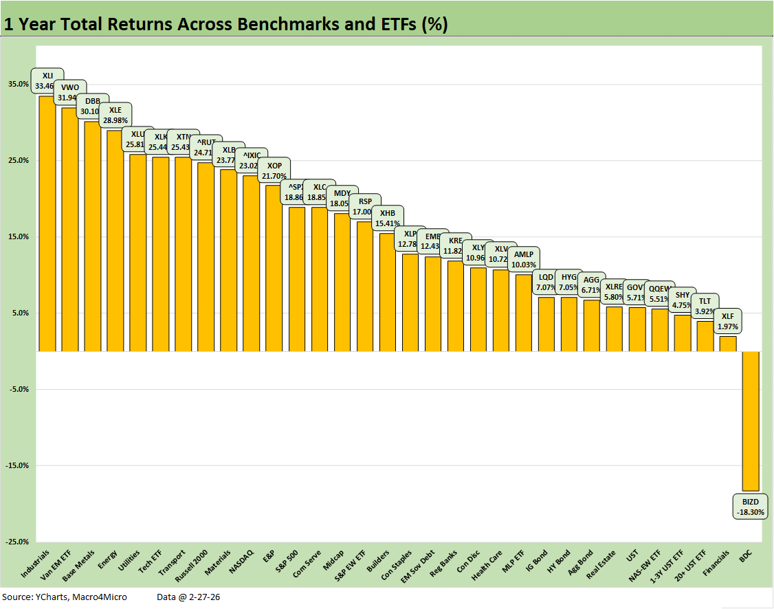 Notable losers in the bottom quartile are led by the BDC ETF (BIZD) on the private credit setbacks and extrapolation effects in the headlines. Emerging asset classes (as mature as private loans are in reality) have a well-traveled history of excess AUM focus out of the chutes that bring problems across the developmental stage of new asset management P&Ls. Here we are again.