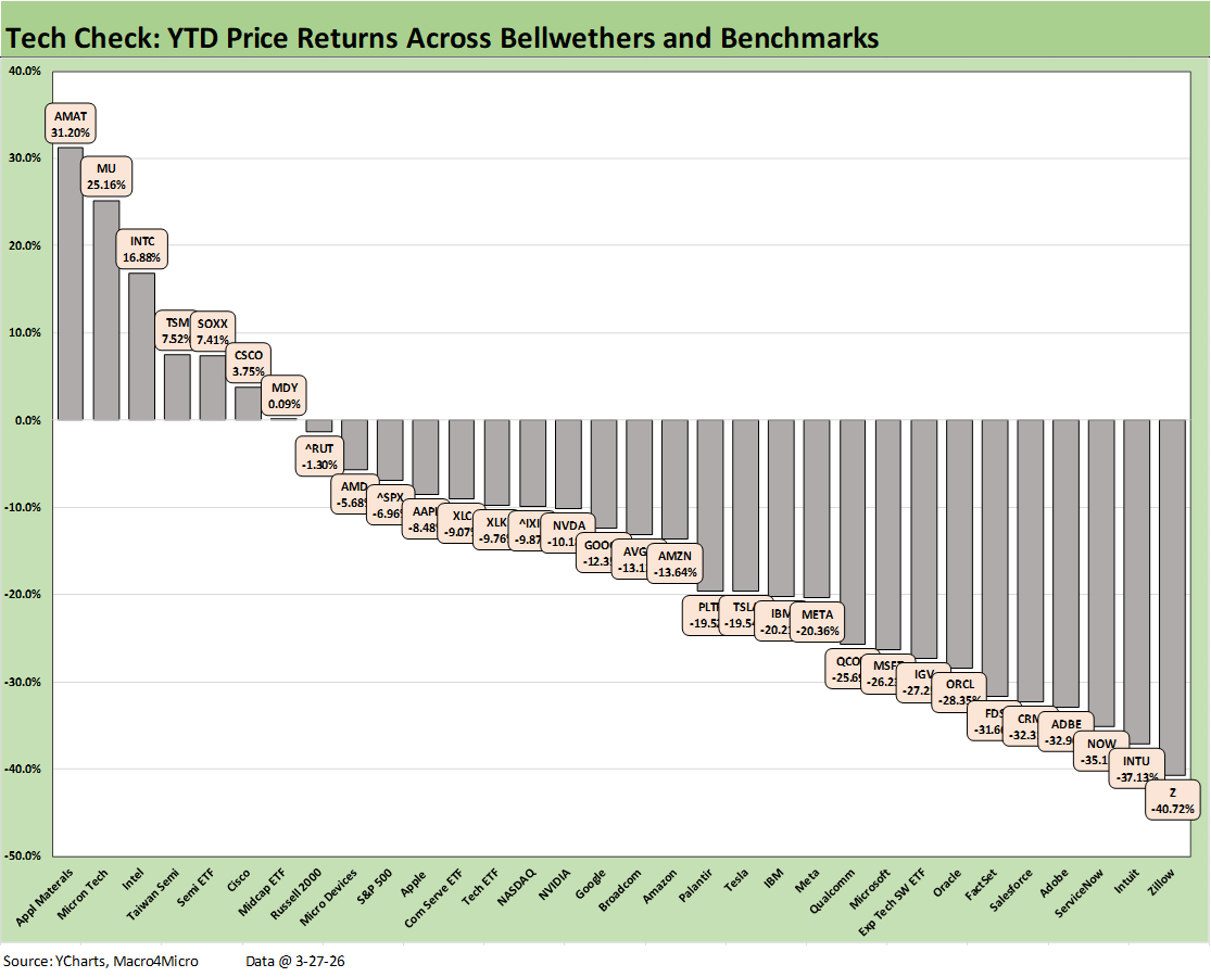 At the top of the bottom quartile we see the Software ETF (IGV) at -27.2% just ahead of Oracle at -28.2%. That is a grim set of returns at the low end that drove a Hi-Lo range in the 32 Tech Check names of almost 72 points. At the top of the rankings we see Applied Materials (AMAT) at +31.2% with Micron (MU) #2 at +25.2% and longtime legacy leader Intel (INTC) at #3 with a +16.9% YTD.