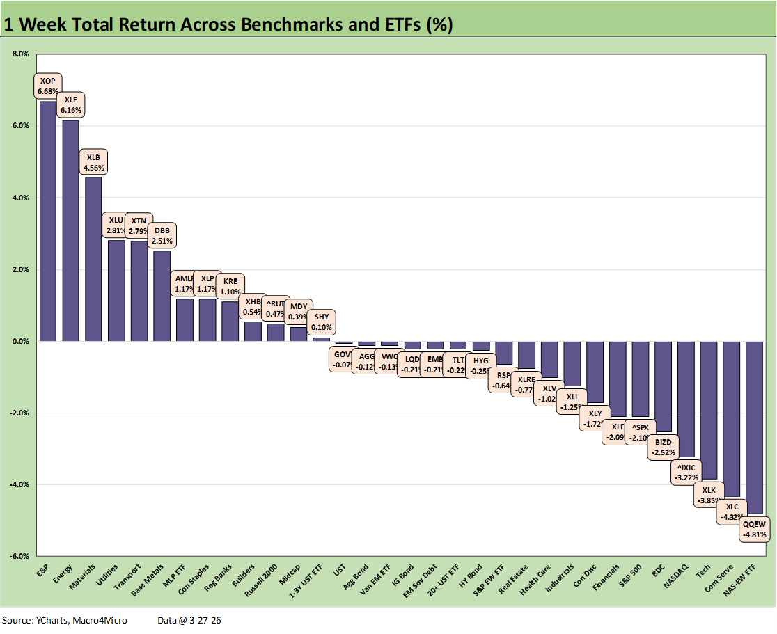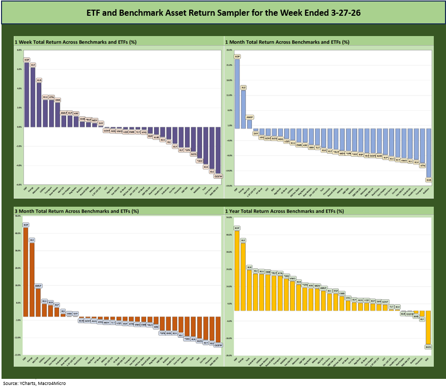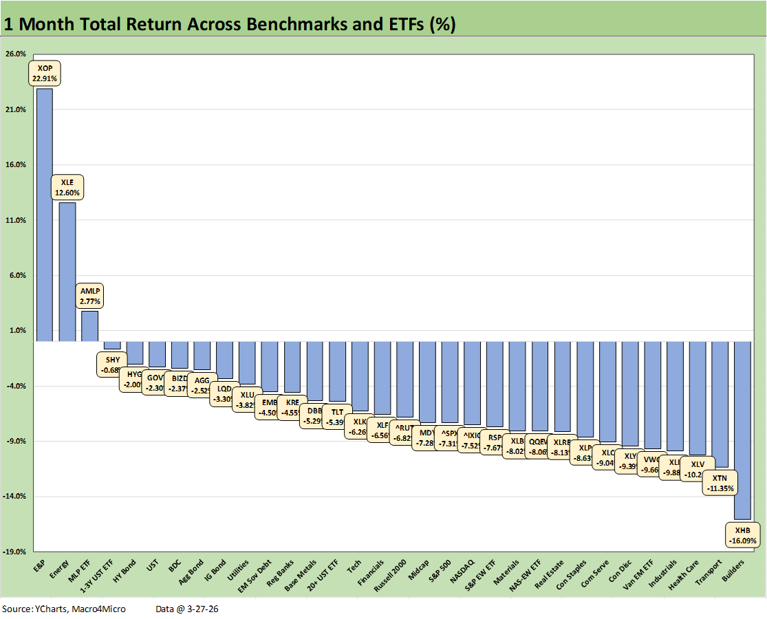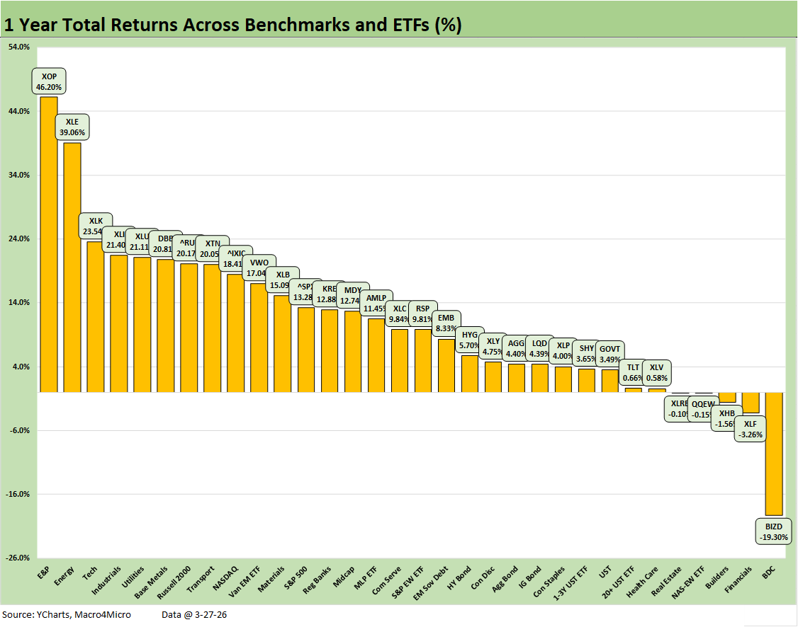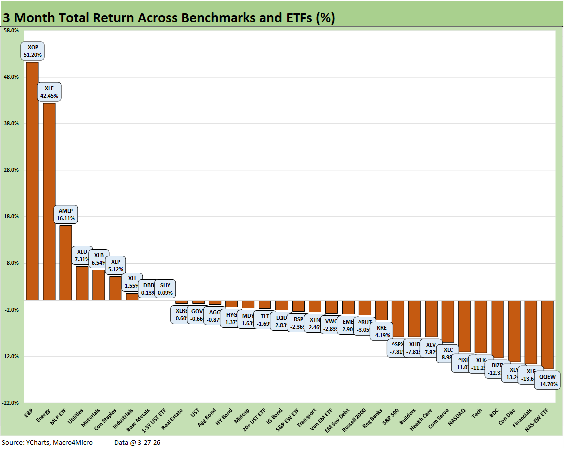 For bond ETFs, we see 6 of the 7 in negative range with the short duration UST 1Y-3Y ETF (SHY) very slightly positive. We covered the UST curve dynamics in this post-Iran mess in a commentary posted yesterday (see UST Deltas: Elevation Realities 3-29-26). The to-and-fro on inflation risk vs. cyclical pressures on payrolls will keep bulls and bears armed with talking points, but the potential for stagflation is on a scale we have not seen since the early 1980s.