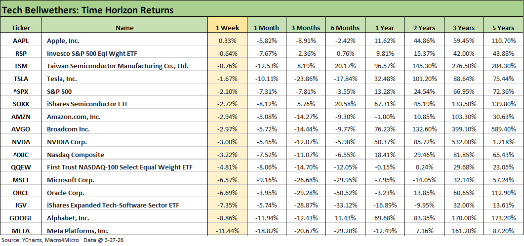 The tech bellwethers show only 1 positive weekly return with Apple (AAPL). We see zero positive returns looking back over 1 month. Over 3 months, the only 2 lines that are positive are Taiwan Semi (TSM) and the Semiconductor ETF (SOXX). For 6 months, we are up to 4 positive lines (only 3 tech lines) with the Semi ETF (SOXX) and Taiwan Semi (TSM) well ahead of the comps. Alphabet (GOOGL) is a distant #3. The Equal Weight S&P 500 Index (RSP) was barely positive for 6 months at +0.76%.