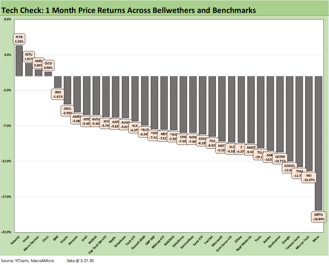The trailing 1-month score for the 32 “Tech Check” names was 4-28 with Palantir (PLTR) at #1 followed by Intuit (INTU) at #2, Advanced Micro (AMD) at #3, and Cisco (CSCO) at #4. Taking the #1 rank only required a +4.28% return for PLTR. Meanwhile, the bottom quartile showed 7 of 8 lines with double-digit negative returns. Meta (META) sat in dead last at -18.9% after the adverse court decisions. We see 3 of the Mag 7 in the bottom quartile with Alphabet (GOOGL) and Tesla (TSLA) joining Meta in the lowest tier.