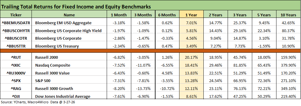 The update of the high-level debt and equity benchmarks captures the obvious pain of 2026 with all negative numbers for 1-month and 3-month timelines for both debt and equity. Tech and growth stock returns in the chart are especially ugly with double digit negative returns for the NASDAQ and Russell 3000 Growth lines.