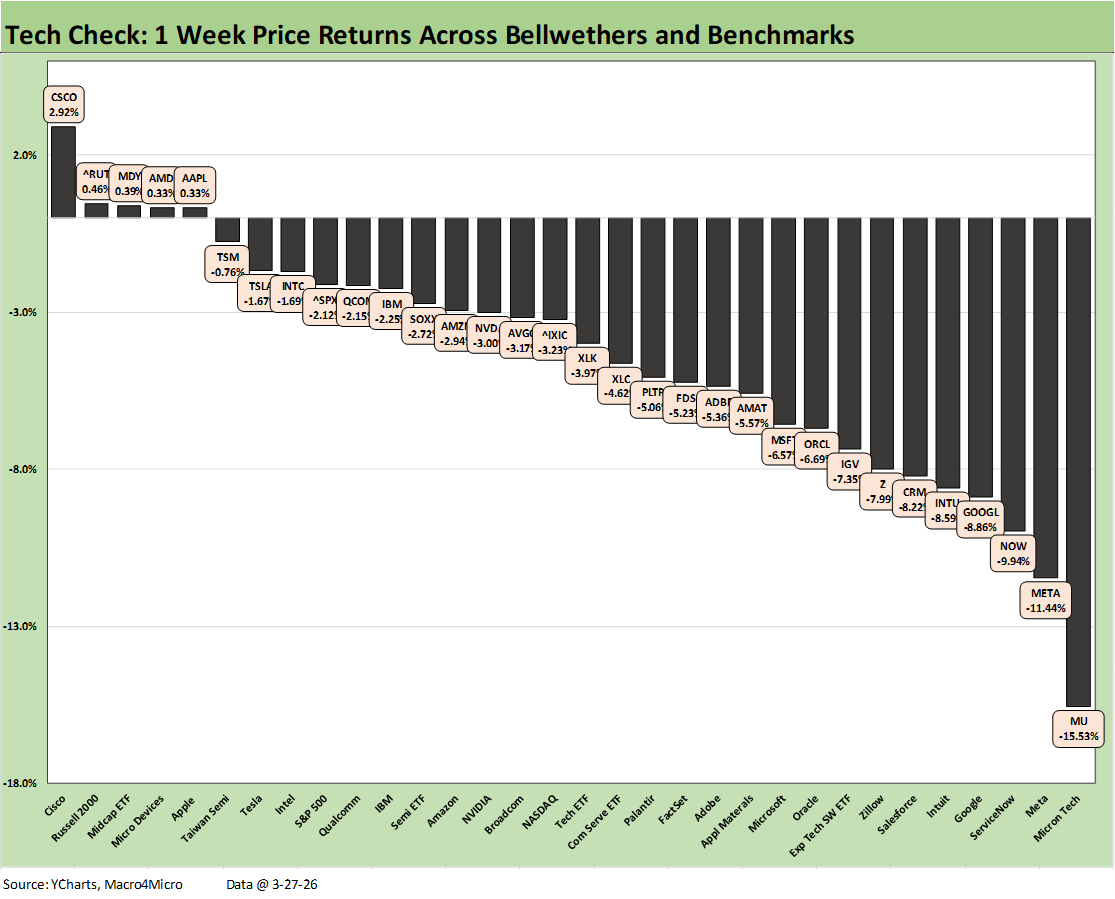 We see a long negative tail with Micron (MU) on the bottom at -15.5% with Meta (META) also in double digit negative return range at -11.4% after the court decisions. Within the mix of Mag 7+3, we see 6 of the Mag 7 in the red and the same for 9 of the Mag 7+3. That’s a bad week.