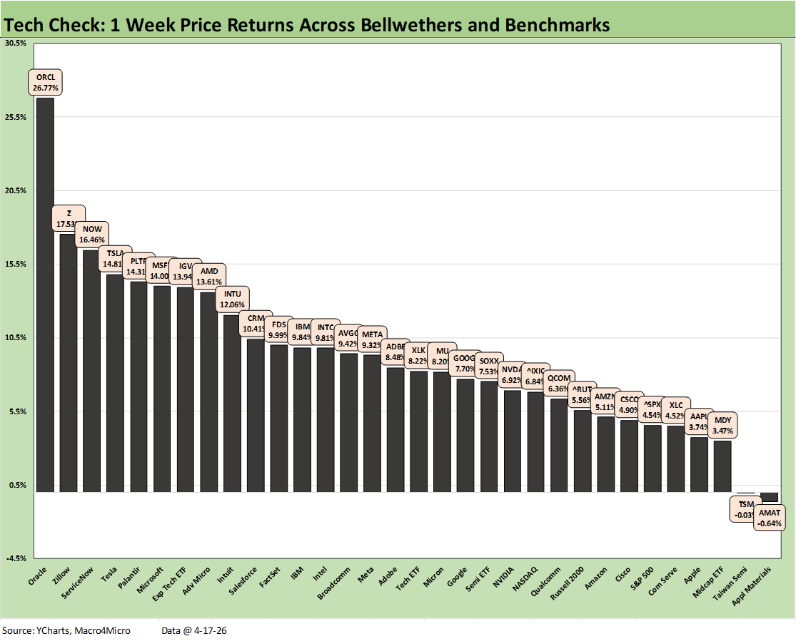 The weekly Tech Check price return chart shows a wild rally for a wide range of the tech subsectors after some recent punishment of SaaS-centric services and software asset lines. The Iran chaos has been a problem for cyclical fears and valuation metrics setbacks that combined with anxiety around tech sector business model threats from AI.