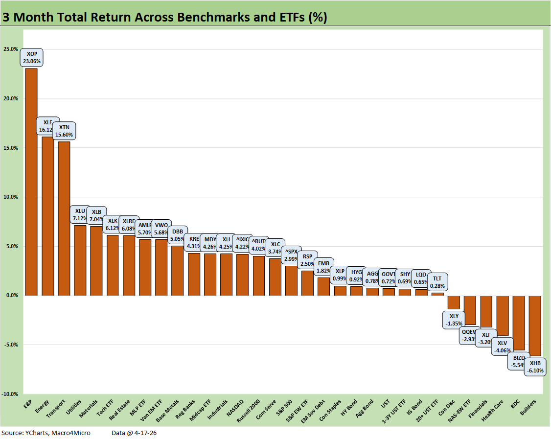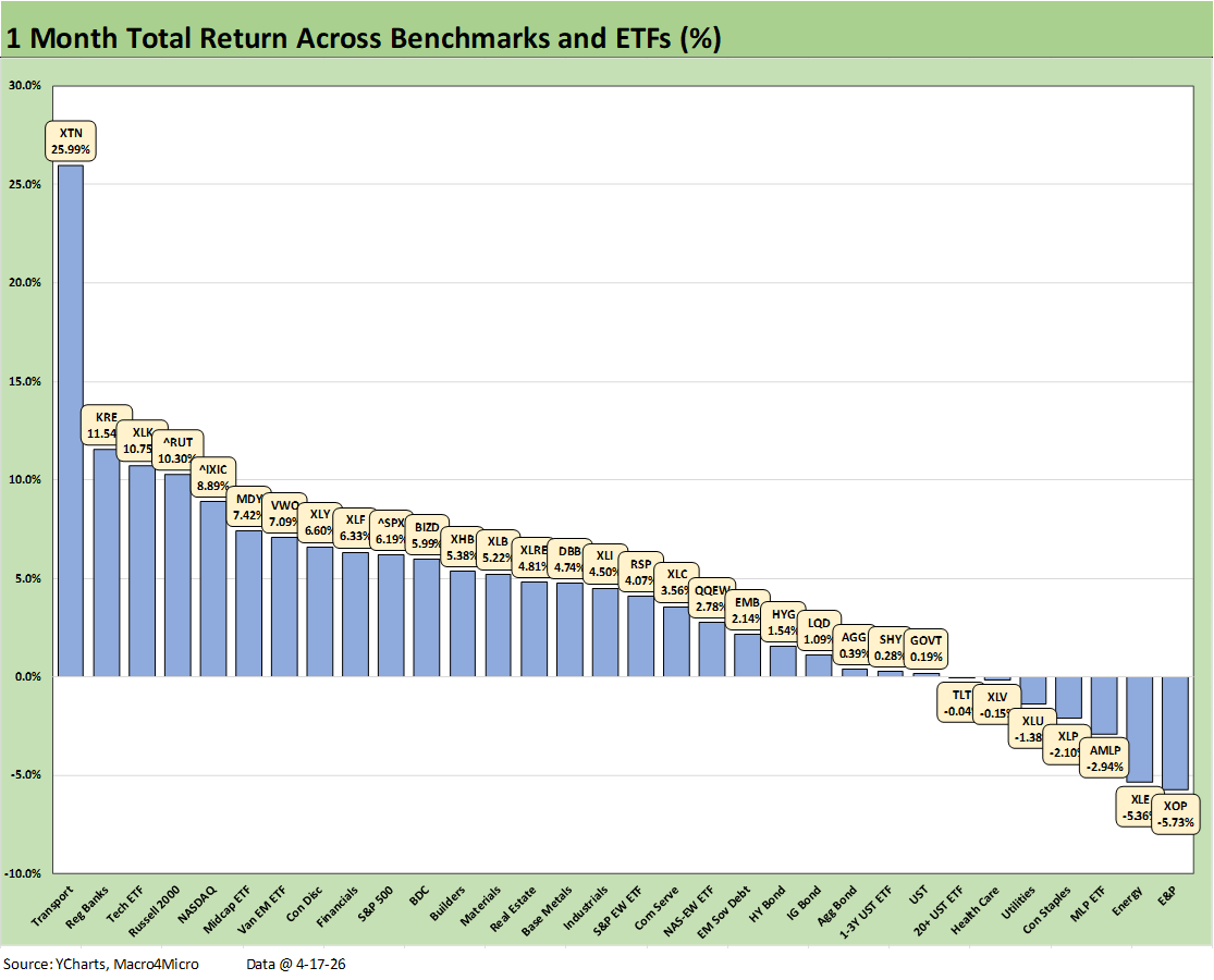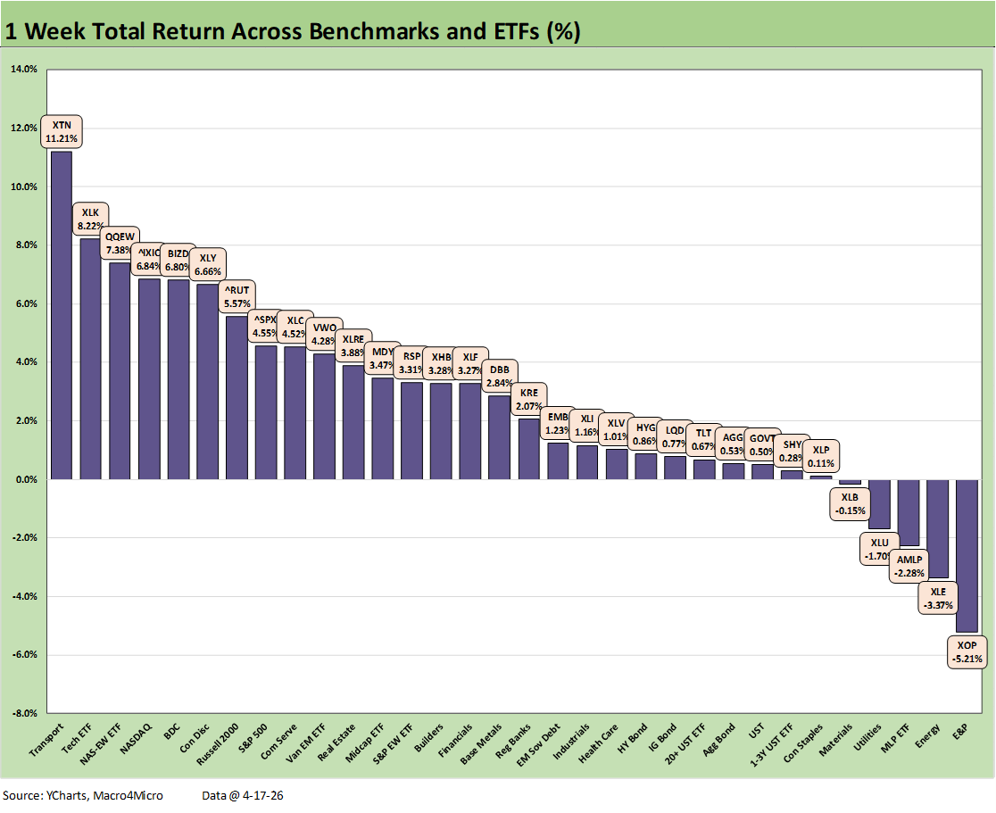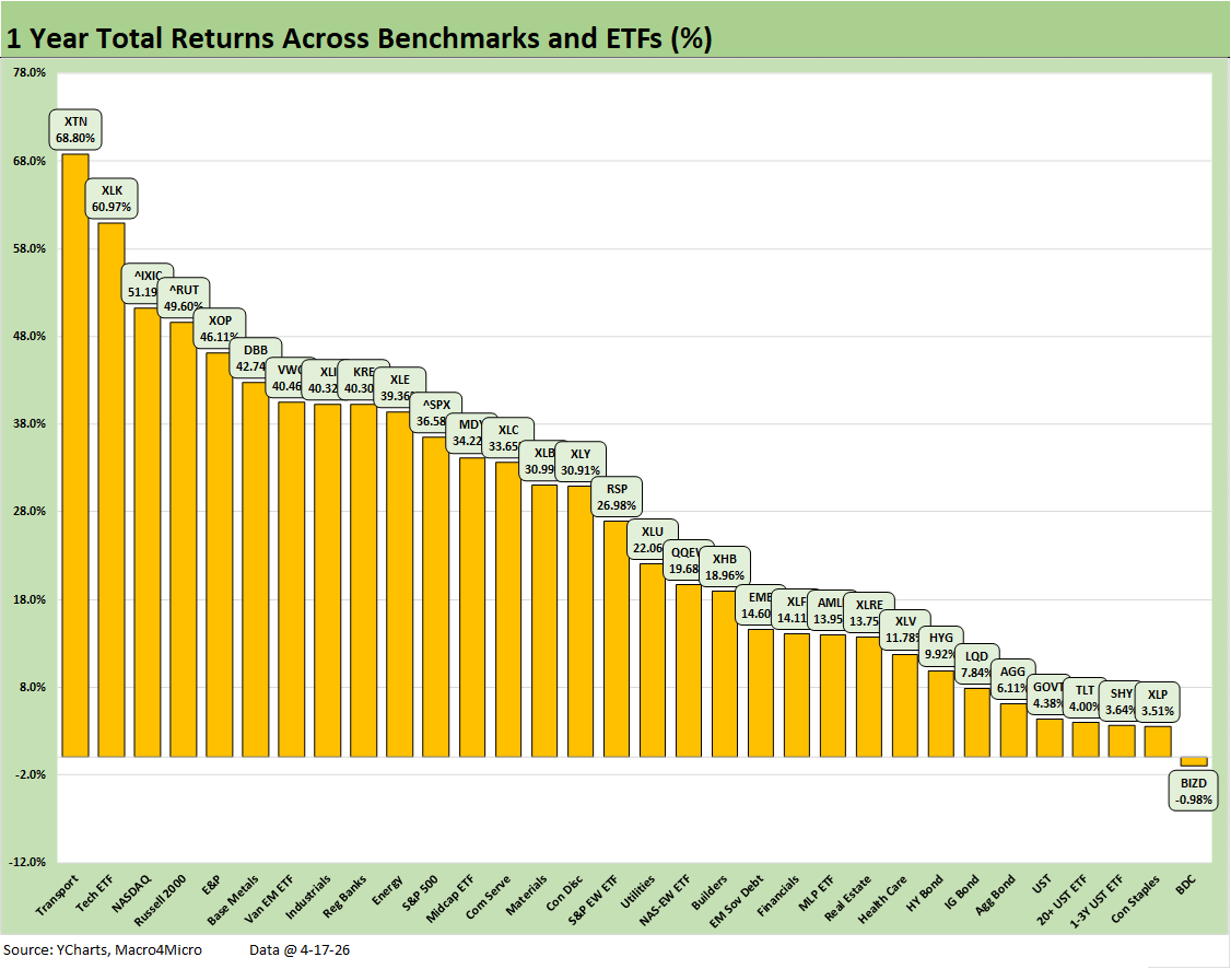 The Transports ETF (XTN) ranked #1 as airlines soared on Iran expectations and related fuel optimism that might bring moderation in upward fare pressures that to this point have not put a dent in volume guidance – yet. The AAL M&A speculation helped during the week, but AAL rejected that overture by the weekend. Freight and logistics providers rallied impressively on a range of factors from Iran and diesel to an easing of AI jitters threatening business models (e.g. freight brokerage). BDCs (BIZD) posted their best week in a while and made the top quartile. The private credit drama will stay hot and heavy with 1Q26 earnings season.