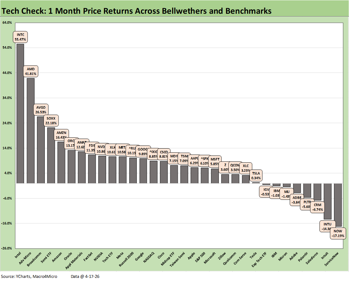 The 1-month “Tech Check” shows the divergence between semiconductors and software and the pain inflicted on the SaaS-centric services operators. The bottom 3 names include ServiceNow (NOW), Intuit (INTU), and Salesforce (CRM). Adobe (ADBE) has been another software name taking a beating along with Palantir (PLTR) as one of the bigger holdings in recent periods in the IGV ETF.