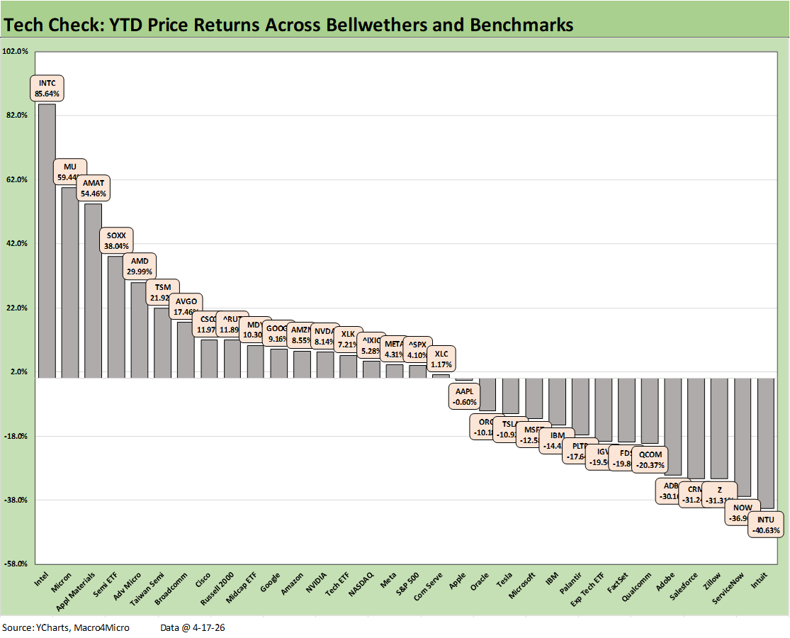 The Hi-Lo return differential between #1 Intel and #32 Intuit is a lofty 126 price return points. If we throw out the Hi-Lo names, we see Micron at #2 vs. ServiceNow at #31 with a return differential of over 96 points YTD. We look at the broader time horizon mix in a separate asset return piece.