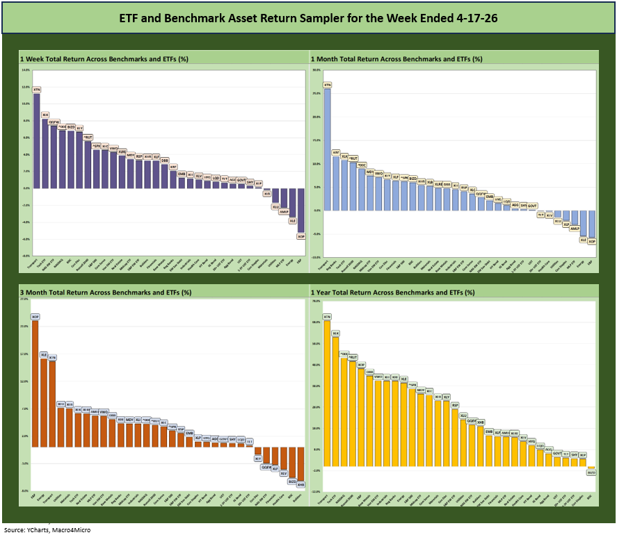 In the next section, we get into the details of the 32 ETFs and benchmarks for a mix of trailing periods. Below we offer a condensed 4-chart view for an easy visual on how the mix of positive vs. negative returns shape up. We see it as a useful exercise in looking for signals across industry groups and asset classes.