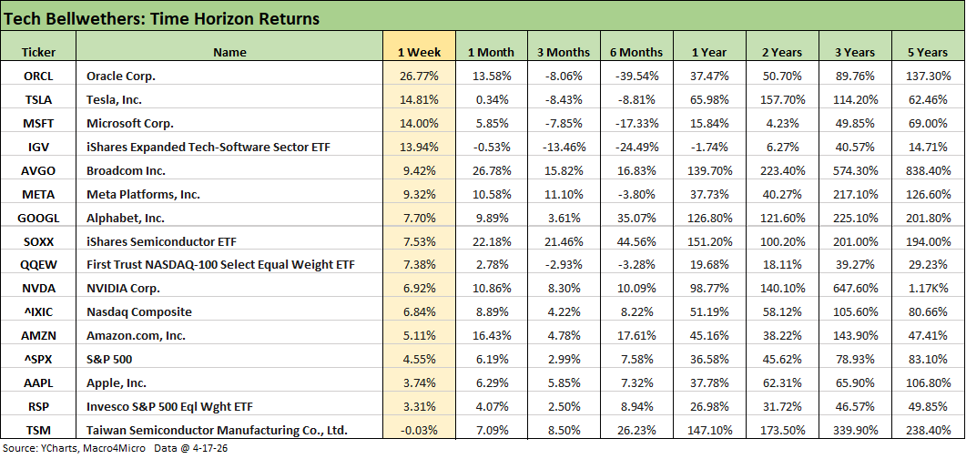 The above table updates the returns for the tech bellwethers and various benchmarks and ETFs. The tech rebound was impressive to say the least with the volatile Oracle (ORCL) rebounding sharply but still negative over 3 months and 6 months. Taiwan Semi (TSM) was the only name slightly in the red, but TSM has been a winner YTD in the top quartile group.
