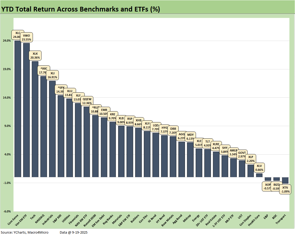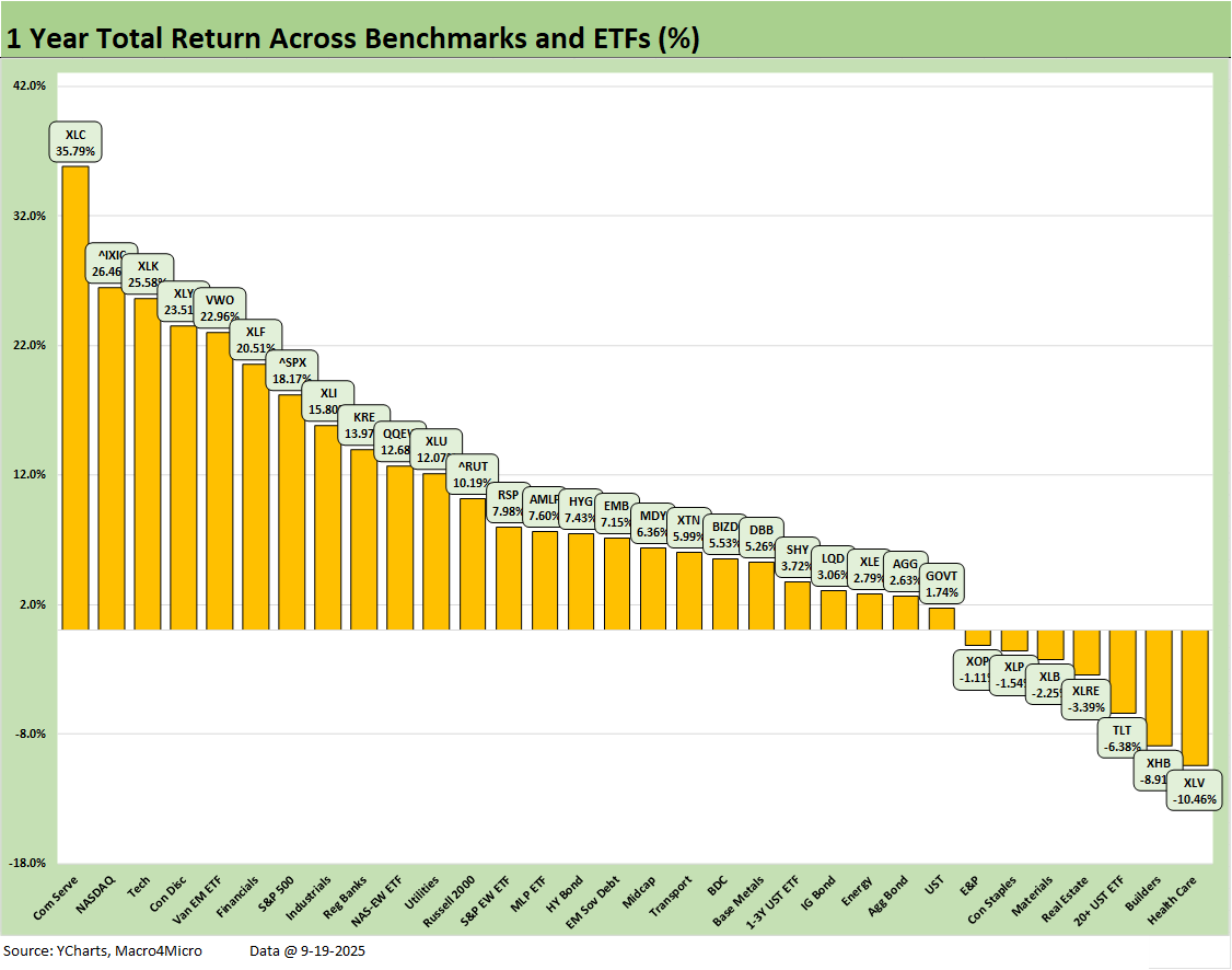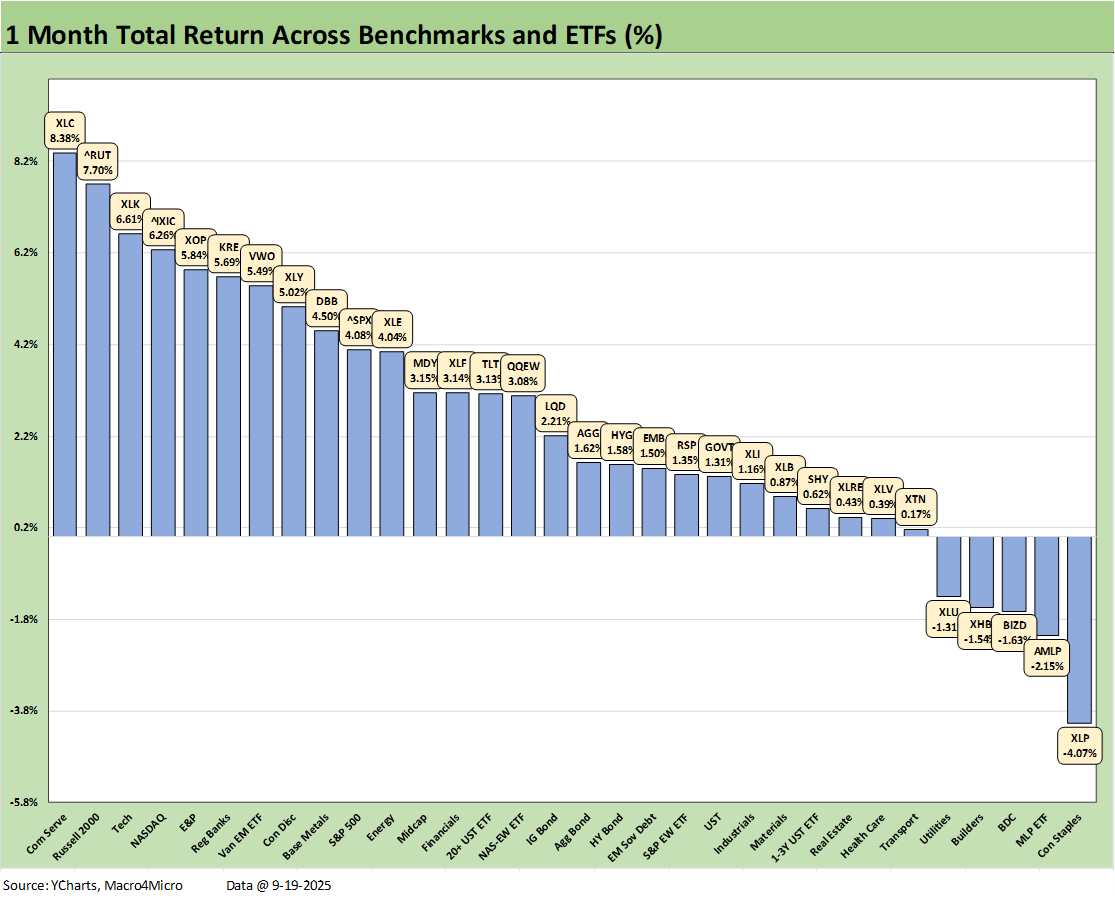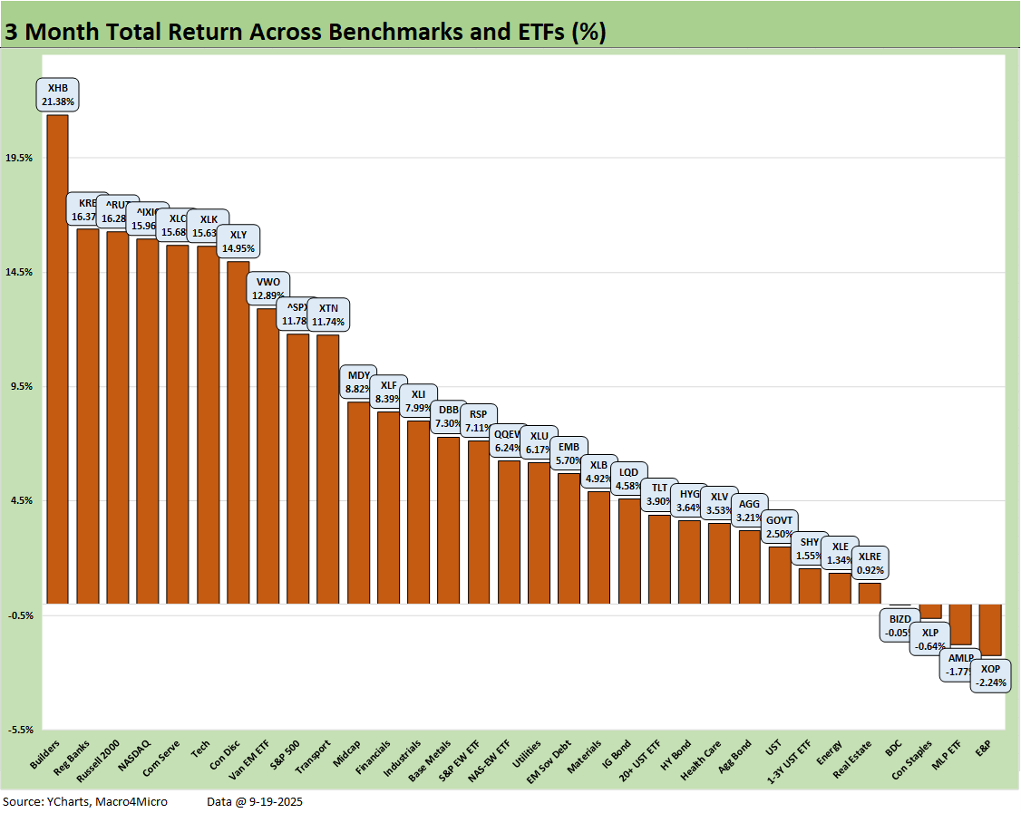 The rolling 3-month numbers at 28-4 include the “afterburn” from the post-Liberation Day rally and now a more optimistic view on where short rates are heading. We see Homebuilding (XHB) on top and E&P (XOP) on the bottom with a Hi-Lo range of 23.6 total return points. Throw out the Hi and Lo asset returns, and we still see a differential of over 18 points. That is a reminder of winners and losers in the selection and weighting process.