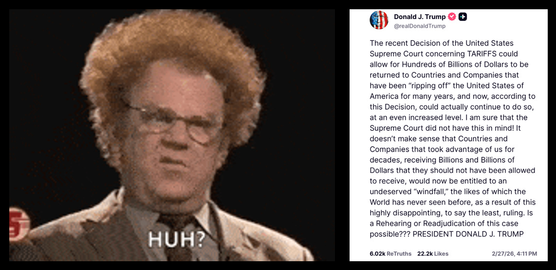 Trump’s message is simple enough. He is seeking a “rehearing or readjudication” of the SCOTUS ruling on IEEPA. On a side note, if a “Super Duper Supreme Court” of appeals is a near term apparition, perhaps an appeal can also be made on the earlier ruling of the President being above the law.