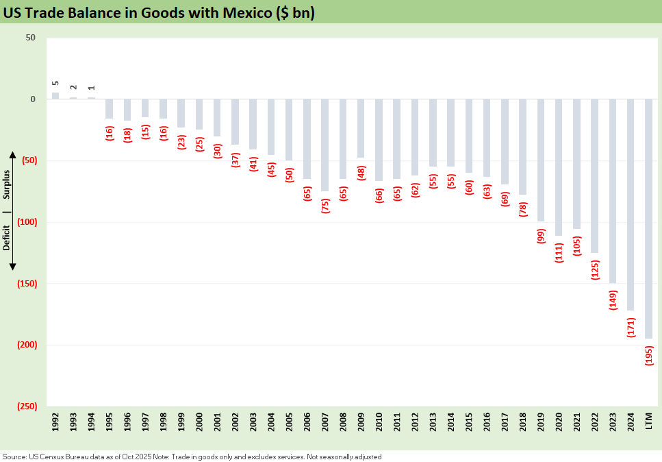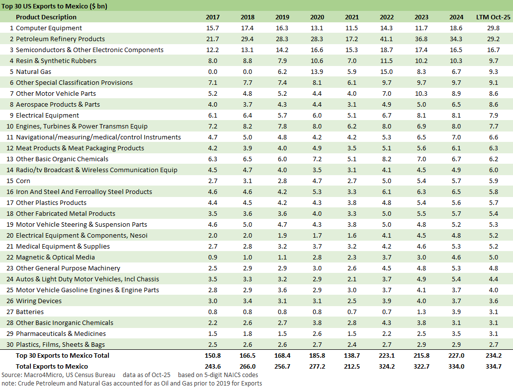 The above chart details the steady growth in trade deficits with Mexico including a new LTM high. In contrast, Canada-US shows a goods trade surplus ex-crude (see Canada-US Trade: Trump Attack N+1 1-25-26).