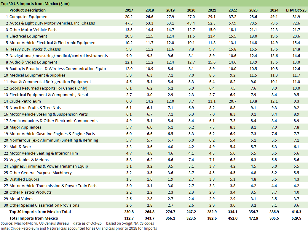 The above chart checks off the import list and product mix of Mexico imports. Autos and supplier chains of all types with a meaningful labor component are typical line items. From autos to tech to consumer electronics and from low value to high value, the range of imports is impressive. Which imports skate by on the USMCA advantage and which could see tariffs spike in a disorderly USMCA negotiation ahead is a material uncertainty. The review process will keep tension high for supplier chains and finished goods operators in 2026.