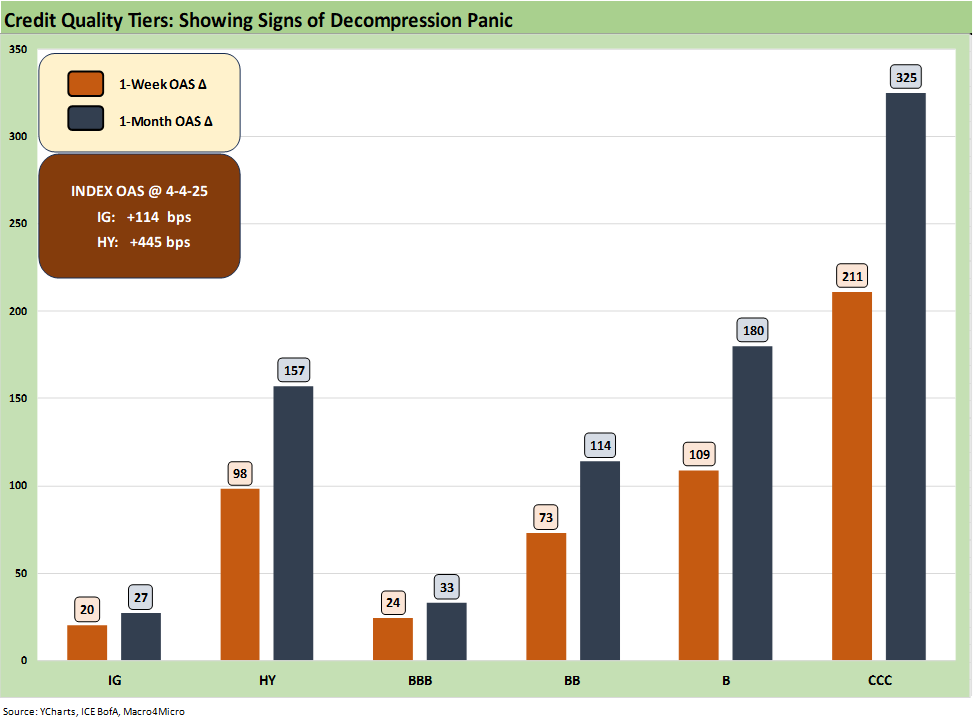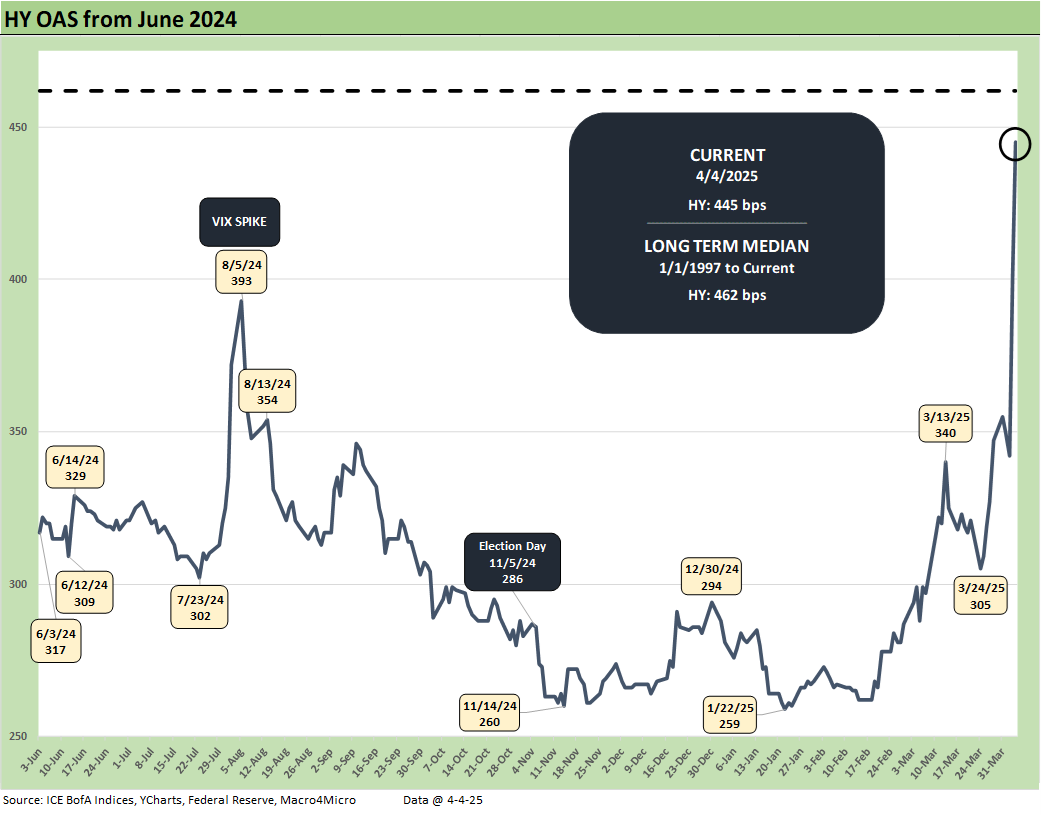 The above chart shows the spread deltas of the past week and past 1-month timeline. HY OAS has blown out by +157 bps over the last month and at +445 bps is just under the +462 bps long-term median. That is a sharp contrast with HY OAS being in the June 2007 spread bubble band less than a month ago (Mini Market Lookback: Tariffs Dominate, Geopolitics Agitate 3-8-25).