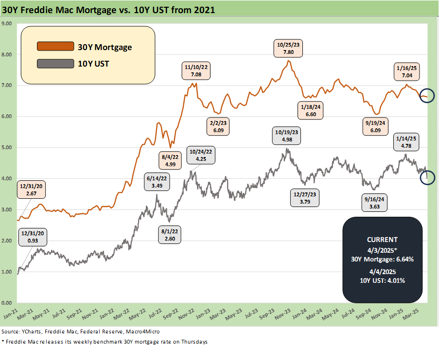 The above chart updates the 10Y UST history relative to the Freddie Mac 30Y benchmark (released at Thursday noon). The 10Y has been moving lower quickly, but the mortgage rates have lagged. We looked at some other mortgage indexes and there was very little movement through Friday with one index -3 bps lower from Mortgage News Daily. It still is not back to the 6.0% handles we saw in Sept. If mortgage rates do get back to that late Sept level, this time the consumer will be in worse shape with builders staring at higher supply chain costs and steady flight/deportation (or hiding) in the labor pool. Consumer credit is also likely to tighten in the direction the market is heading.