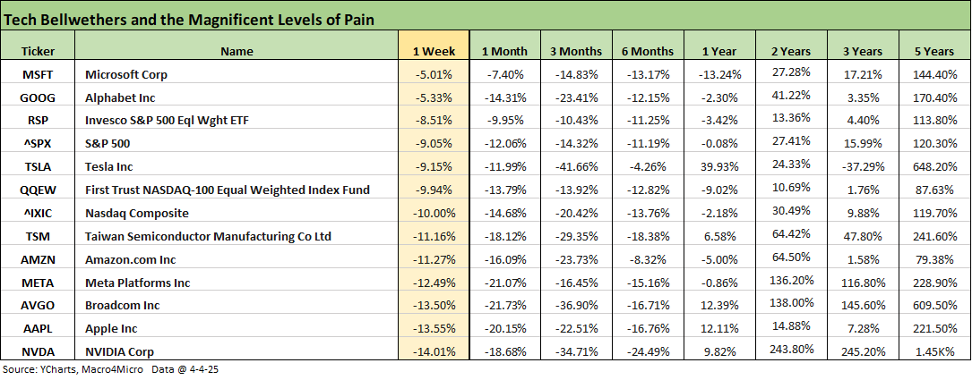 The above chart lines up the tech leaders (Mag 7+ Broadcom + Taiwan Semi) in descending order of total returns for the week. We see all lines negative over the 1-week, 1-month, 3-month, and 6-month period. We also include some benchmarks: the S&P 500, the NASDAQ, Equal Weight NASDAQ 100 (QQEW) and Equal Weight S&P 500 (RSP). Looking back across the 1-year returns, we see 9 of 13 lines negative with 4 of the Mag 7 negative with Tesla, Apple, and NVIDIA positive.