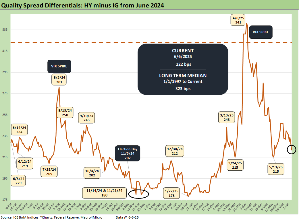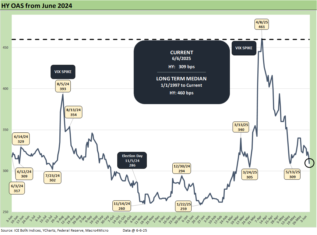 The above chart updates the 1-week and 1-month OAS deltas. The good news followed Trump pulling back from many of his more extreme tariff actions, but he dropped in a doubling of steel and aluminum to 50% to remind trade partners he is not going soft. Unfortunately, that latest move appeared to be part of his economic coercion program against Canada that could elicit a more aggressive response given the domestic pressure on Carney from many sources (see Tariffs: Testing Trade Partner Mettle 6-3-25).