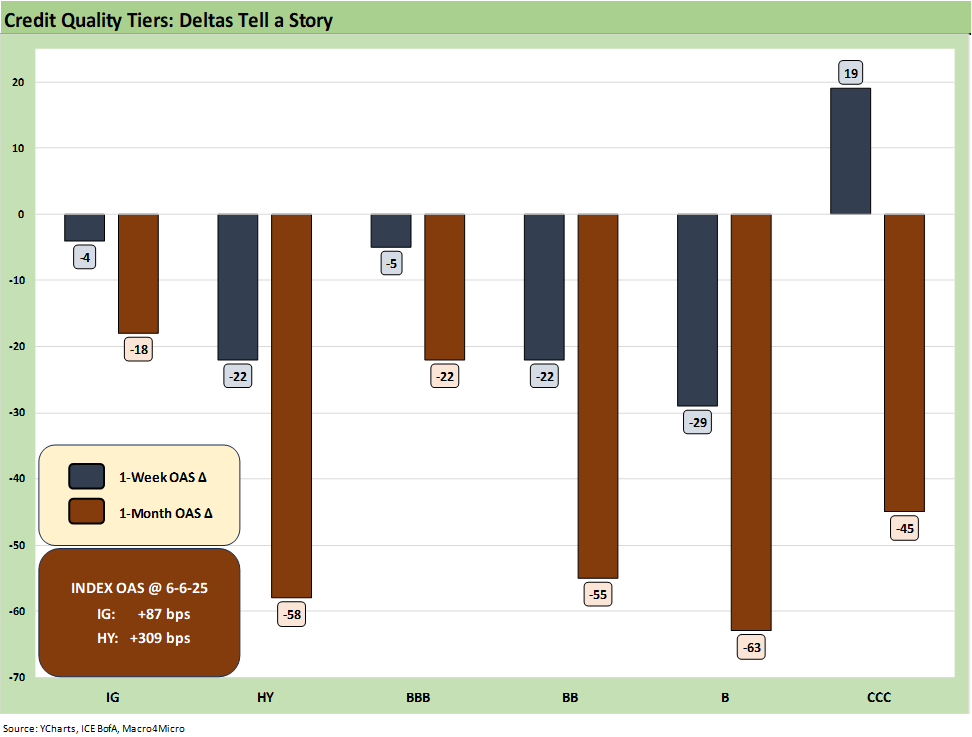 The “BB OAS minus BBB OAS” quality spread differential tightened to +65 bps this week from +82 bps last week. The -22 bps on the BB tier was the main driver vs. -5 bps on the BBB tier.