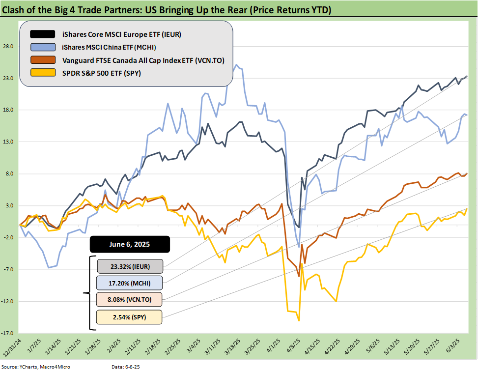 We update the Battle of the Trade Partners above. As a reminder, we use a cross-section of benchmark equity ETFs for the 4 major clashing trade partners – US vs. Europe vs. China vs. Canada. We use what we consider to be useful ETFs that frame those markets across a diversified mix of industries and market caps. We let the US off easily by using the S&P 500 ETF (SPY) since generally small caps and midcaps have lagged YTD. The US had moved back into positive range but remains well behind the pack and notably Europe and China. As Golden Ages go, this one needs some work or some more precious metals on the list. Trump will blame Powell.