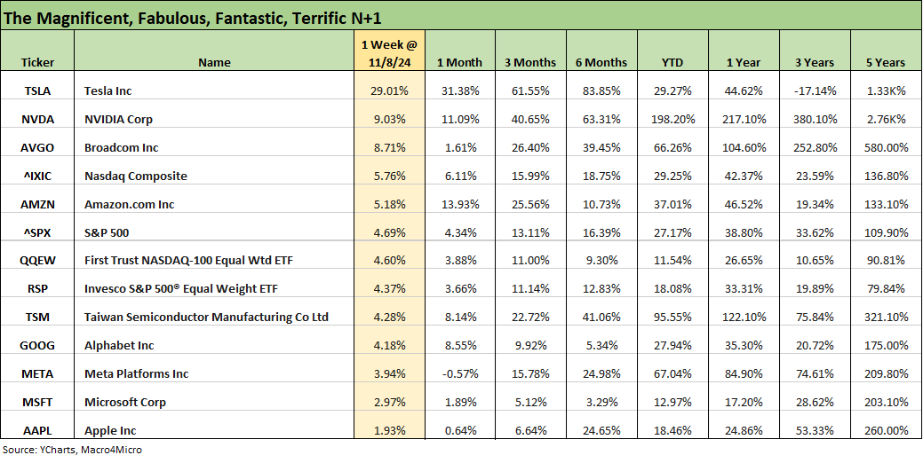 The bellwethers above are comprised of the Mag 7 + Taiwan Semi + Broadcom. We noted Tesla’s off-the-charts week already. For the other bellwethers, all the lines were in positive territory this week after a bumpy few weeks. We see 4 of the Mag 7+ bringing up the rear this week with NVIDIA a solid #2 and Broadcom at #3. The rest of the pack is well behind with Apple on the bottom and weaker for the 1-month horizon. Meta is negative for the month and Microsoft is also lagging the group over the 1-month period.